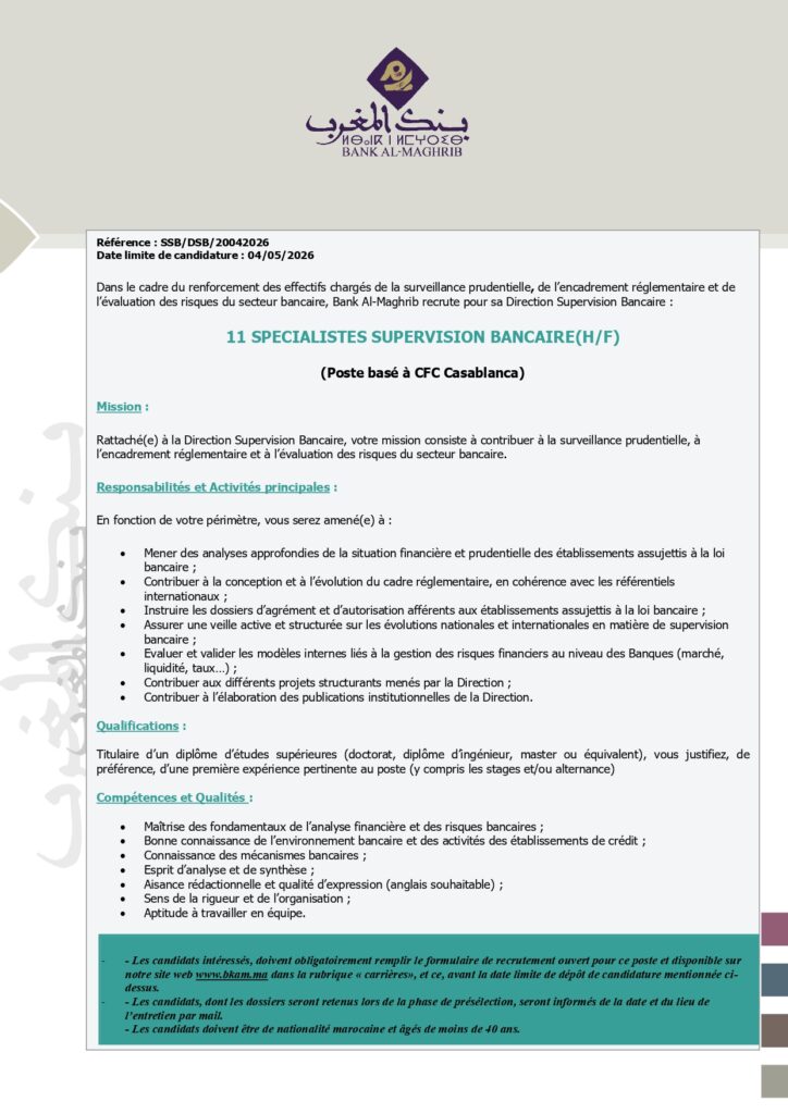 إعلان عن مباراة توظيف (16) منصب ببنك المغرب (Bank Al-Maghrib)، آخر أجل 4 ماي 2026