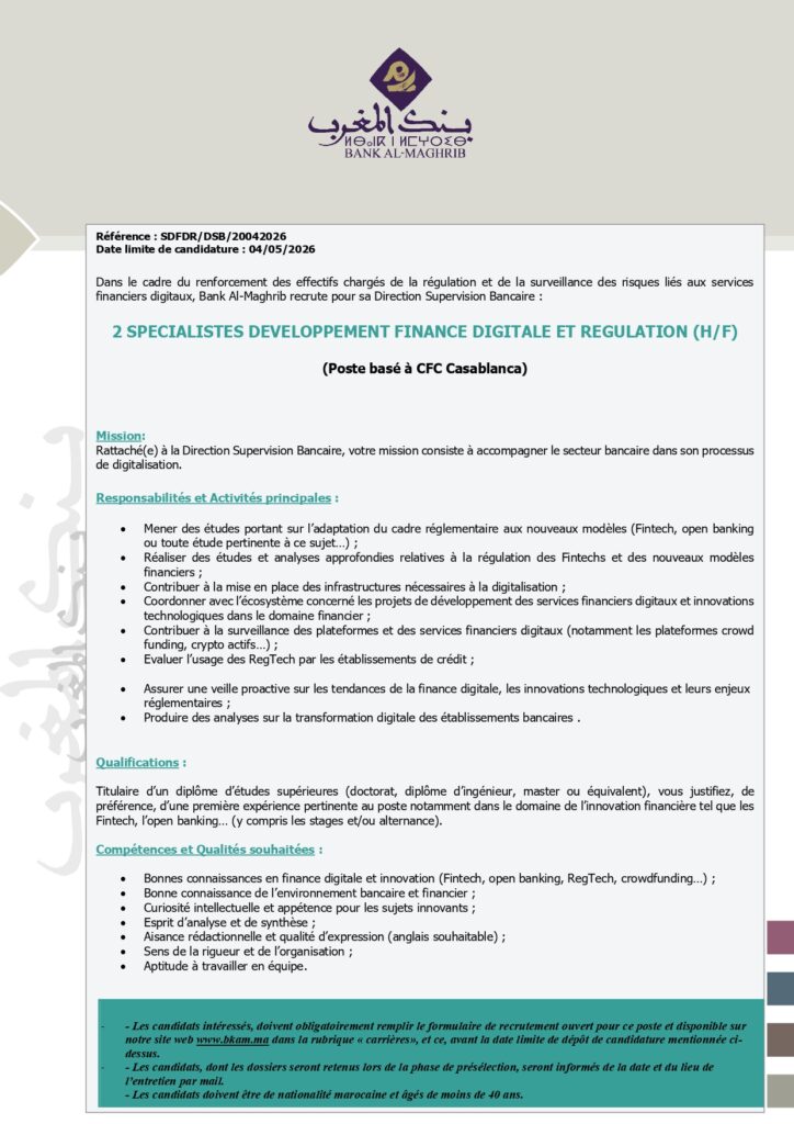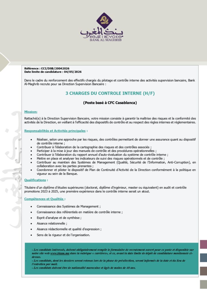 الإعلان يتطلب شهادات جامعية في تخصصات المالية، المحاسبة، أو تكنولوجيا المعلومات حسب المنصب المراد التقدم له. كما يشترط خبرة مهنية سابقة في المجالات التالية: المراقبة البنكية، المراقبة الداخلية، أو تطوير المالية الرقمية.