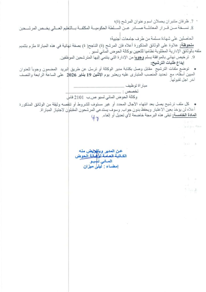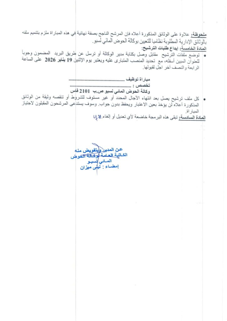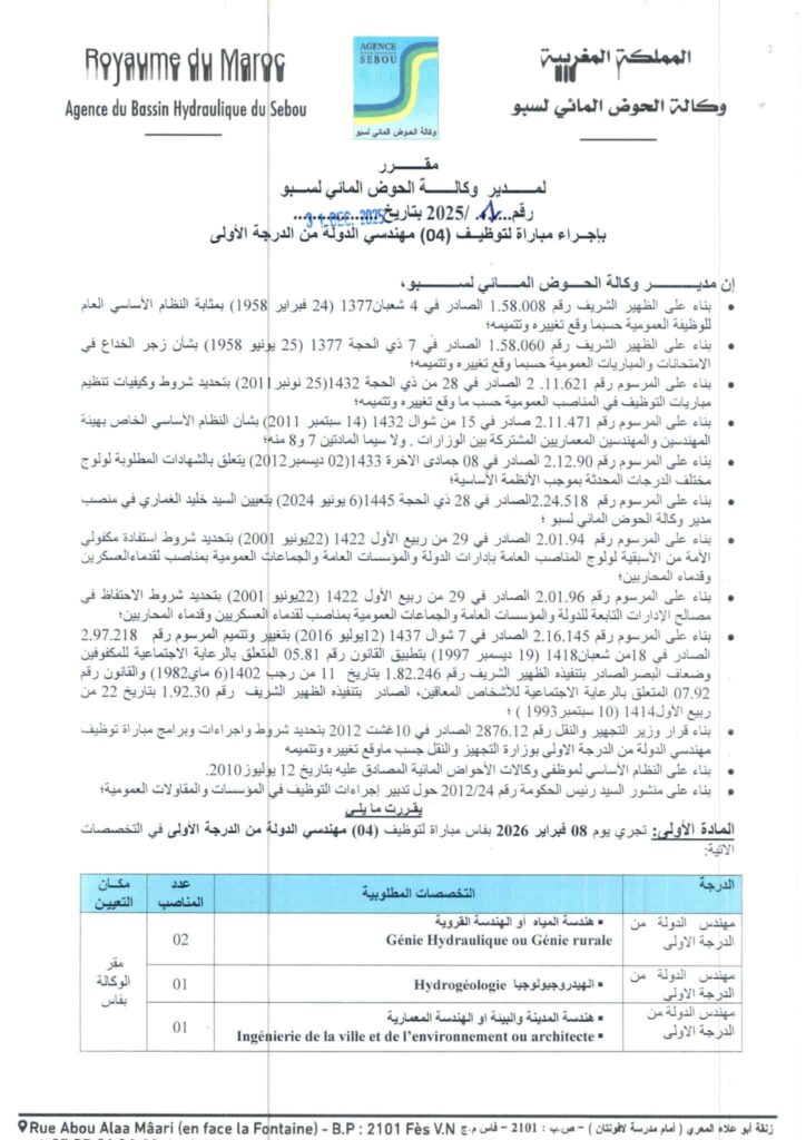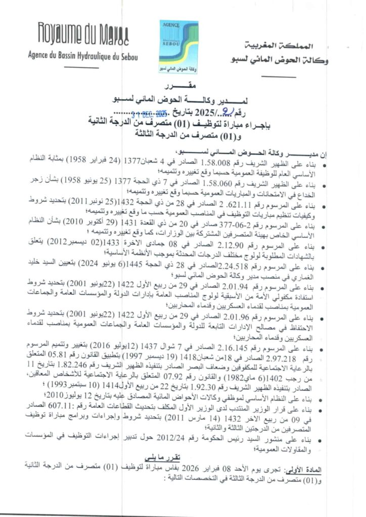 تنظم وكالة الحوض المائي لسبو: مباراة لتوظيف (8) مناصب، آخر أجل 20 يناير 2026