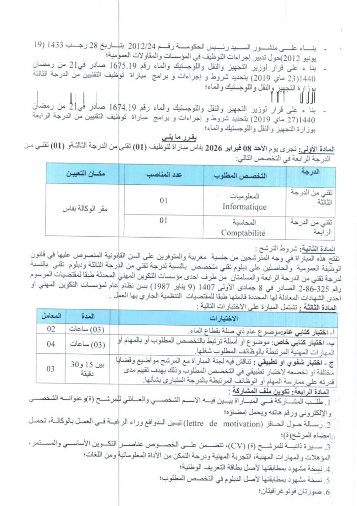 تُنظِّم وكالة الحوض المائي لسبو (Agence du Bassin Hydraulique du Sebou) مباراة لتوظيف 8 مناصب موزعة على التشكيلات التالية: