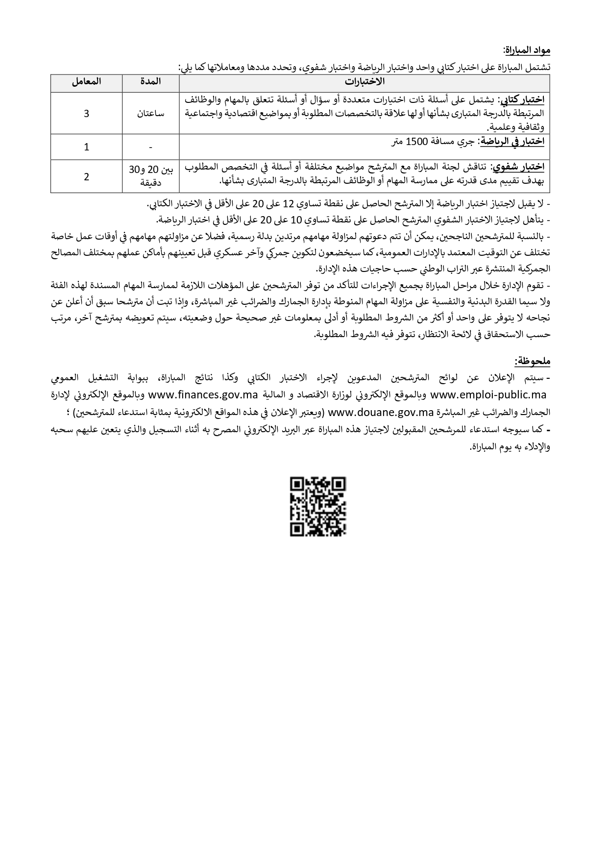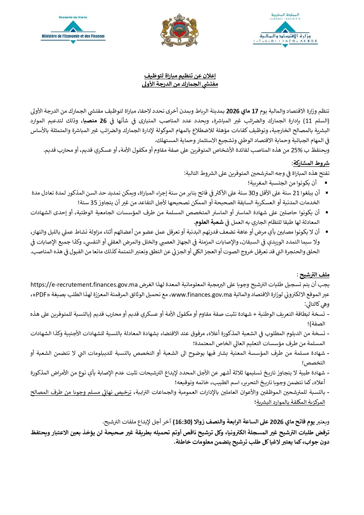 تنظم وزارة الاقتصاد والمالية يوم الأحد 17 ماي 2026 بـالرباط وبمدن أخرى تُحدد لاحقاً، مباراة لتوظيف 26 مفتش جمارك من الدرجة الأولى بـإدارة الجمارك والضرائب غير المباشرة. يُخصص 25% من المناصب لفائدة الأشخاص المتوفرين على صفة مقاوم أو مكفول الأمة أو عسكري قديم أو محارب قديم.