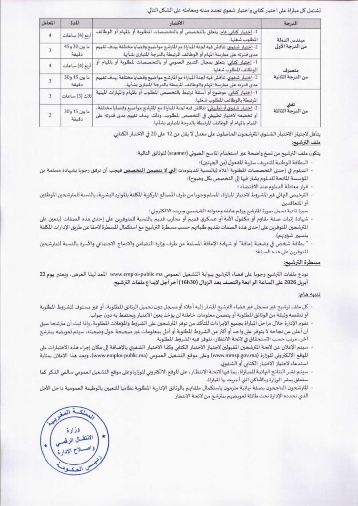 تنظم وزارة الانتقال الرقمي وإصلاح الإدارة مباراة لتوظيف 75 منصب في 22 أبريل 2026. تشمل المناصب 41 مهندس دولة من الدرجة الأولى، و19 متصرفا من الدرجة الثانية، و15 تقنيا من الدرجة الثالثة.