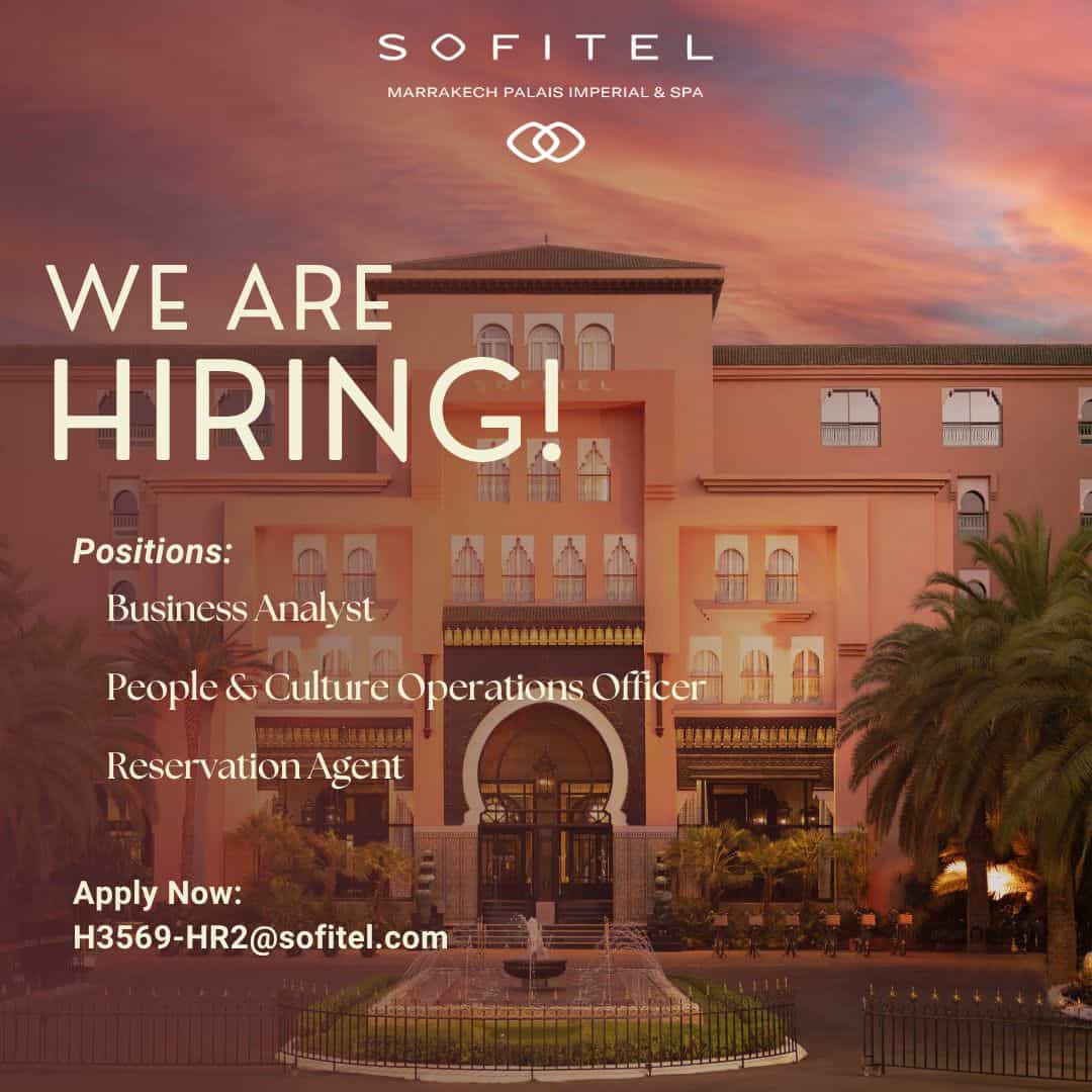 Sofitel Marrakech Palais Imperial & Spa recrute 3 profils à Marrakech : un Business Analyst, un People & Culture Operations Officer et un Reservation Agent. Ces postes s'adressent à des candidats souhaitant évoluer dans l'hôtellerie haut de gamme au sein d'un établissement de référence.