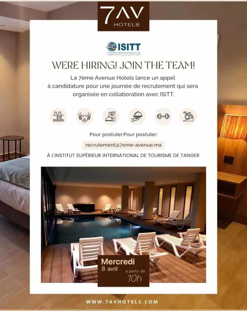 Les candidatures doivent être envoyées par e-mail à recrutement@7eme-avenue.ma. Une journée de recrutement est organisée en collaboration avec l'Institut Supérieur International de Tourisme de Tanger.