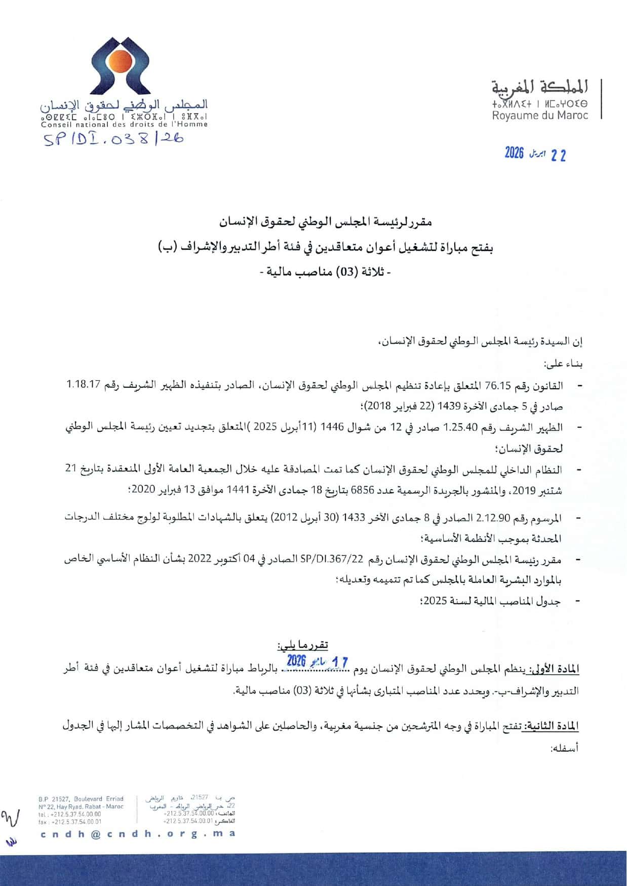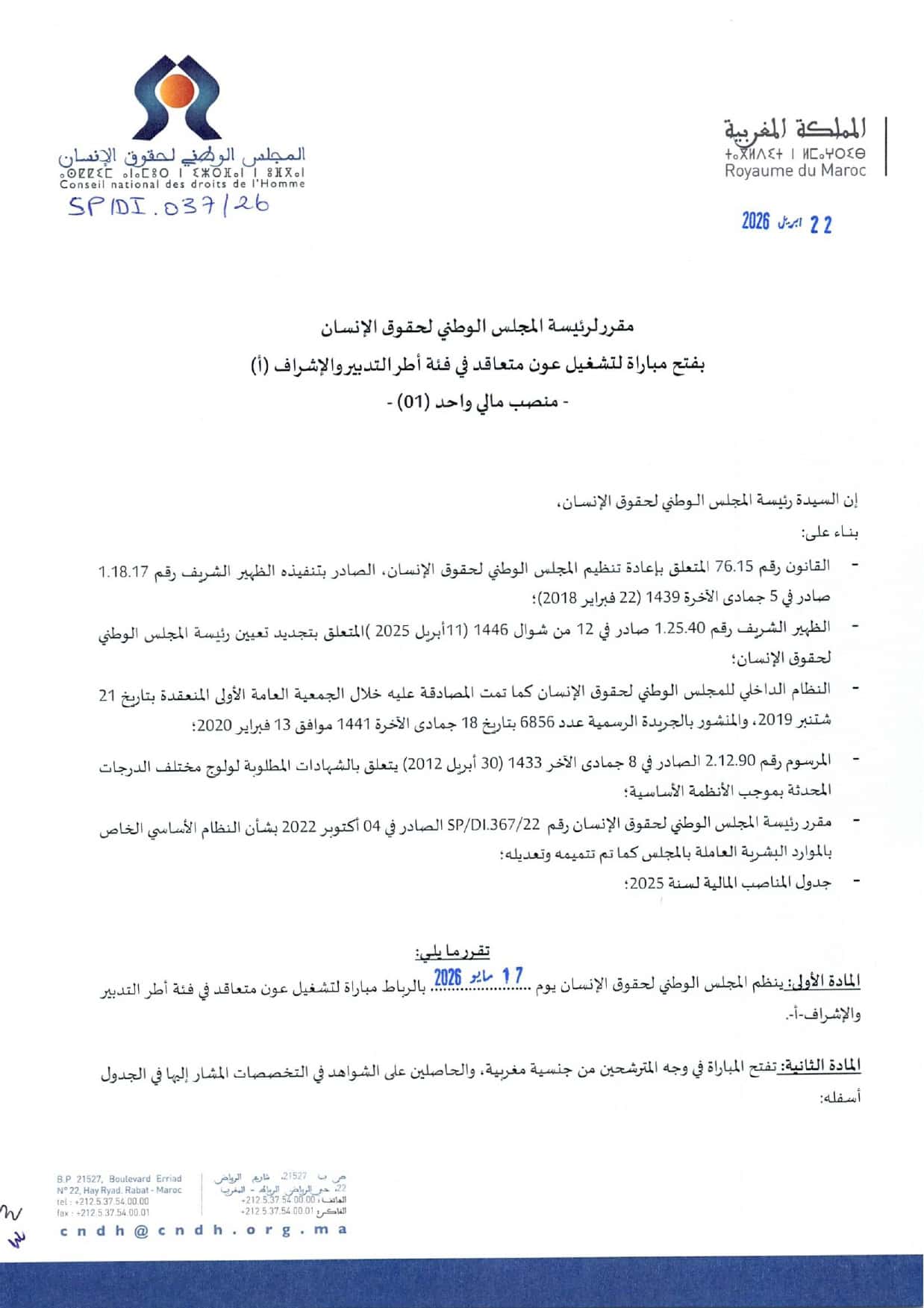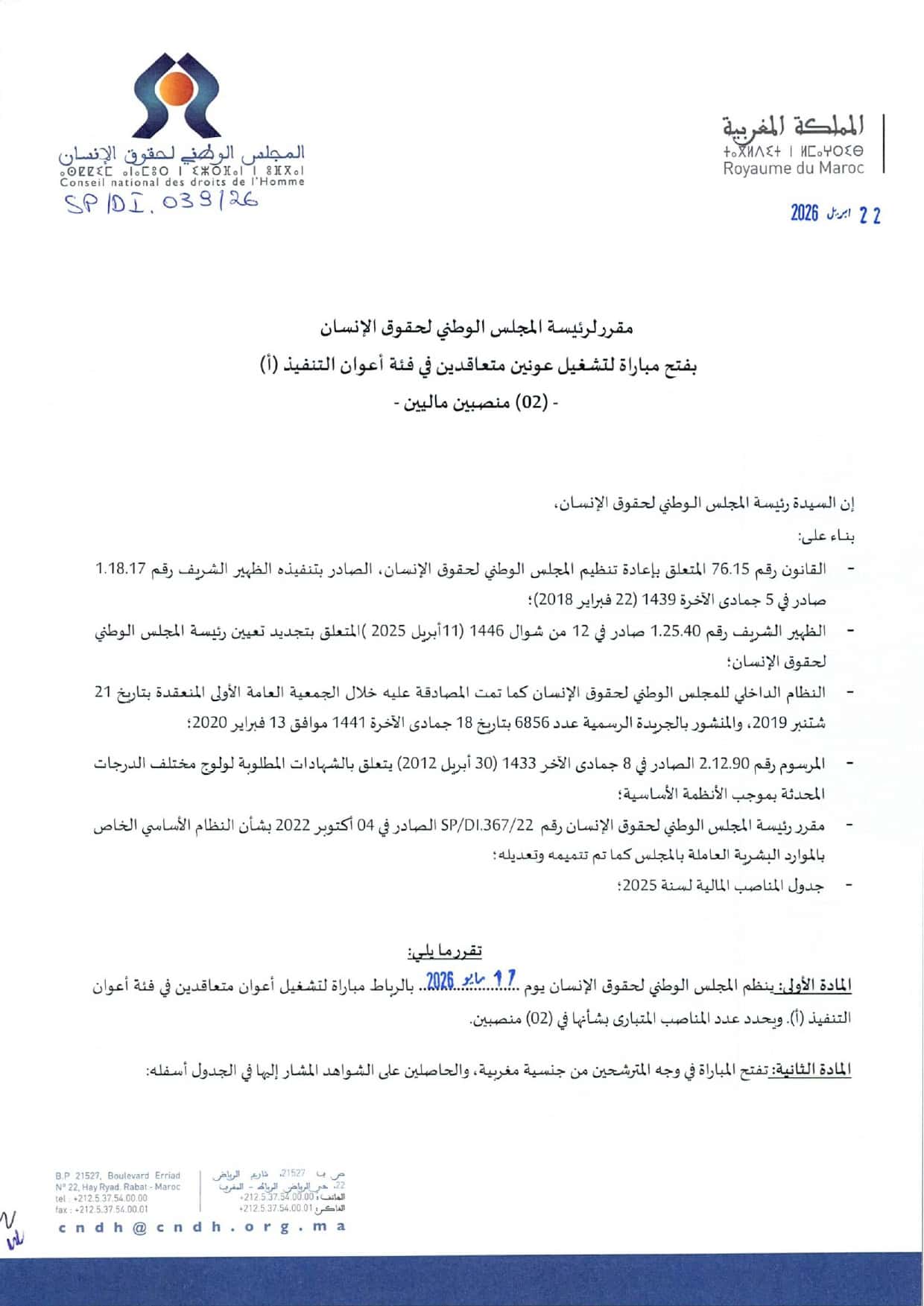 Le Conseil National des Droits de l’Homme (CNDH) organise un concours pour le recrutement de plusieurs postes au titre de l'année 2026.