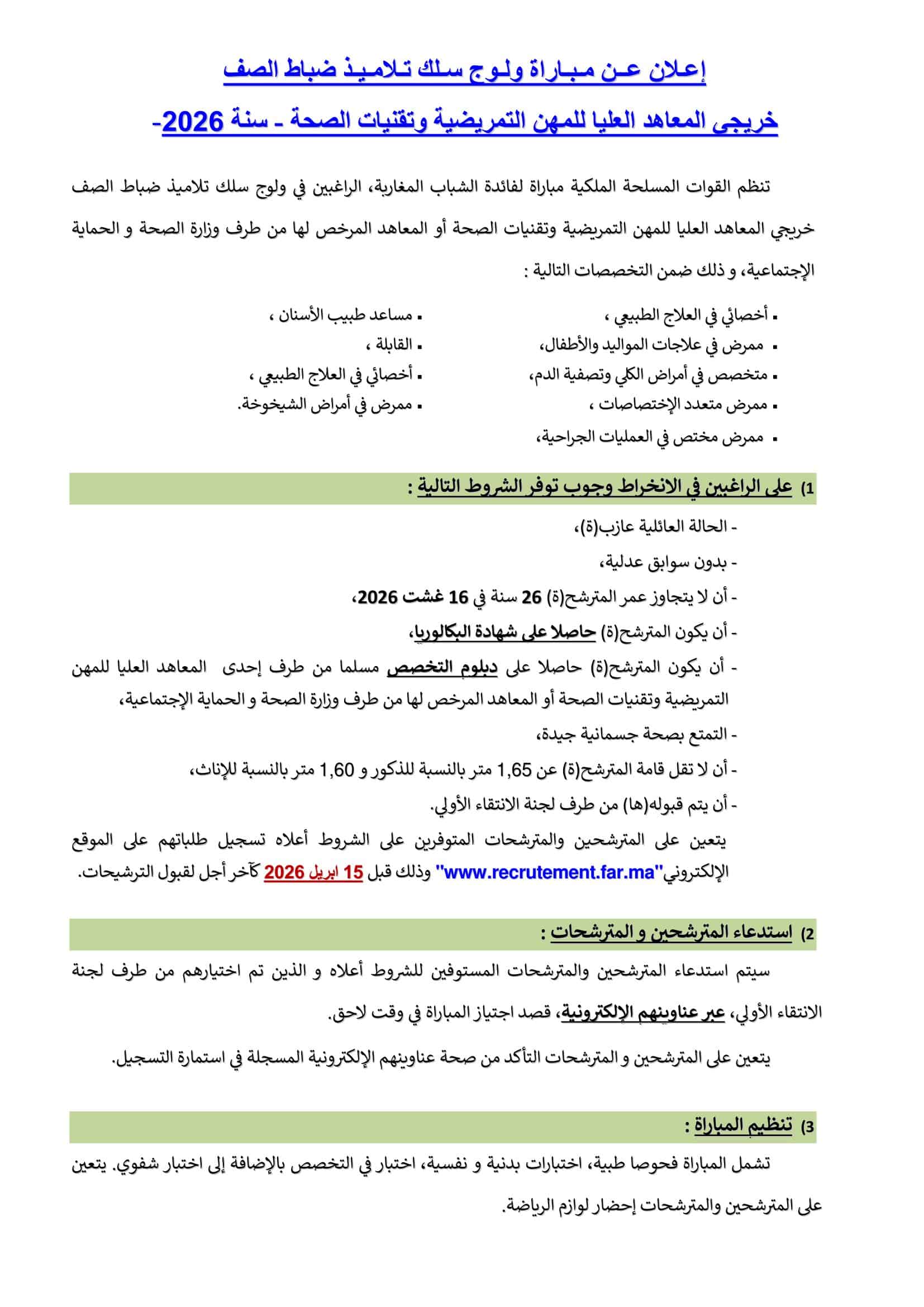 Le concours d'admission au cycle des élèves officiers du rang des Forces Armées Royales (FAR) s'adresse aux lauréats des Instituts Supérieurs Privés d'Infirmiers et de Techniques de Santé (ISPITS) ainsi qu'aux diplômés des instituts agréés au Maroc. Ce concours vise à recruter des professionnels de santé pour intégrer les rangs des Forces Armées Royales.