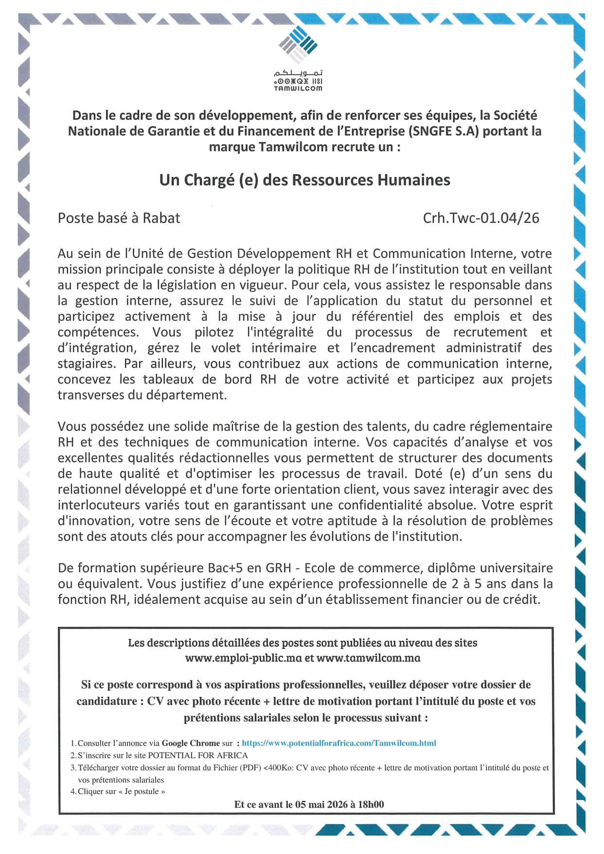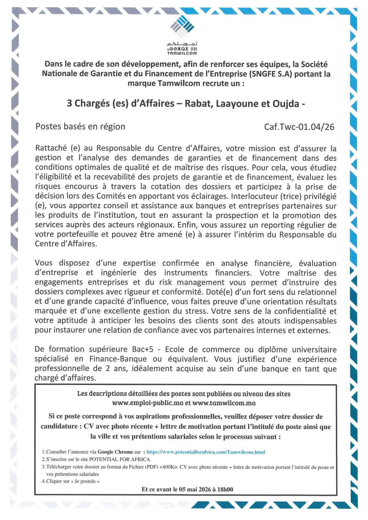 Le dernier délai pour soumettre votre candidature est fixé au 5 Mai 2026.