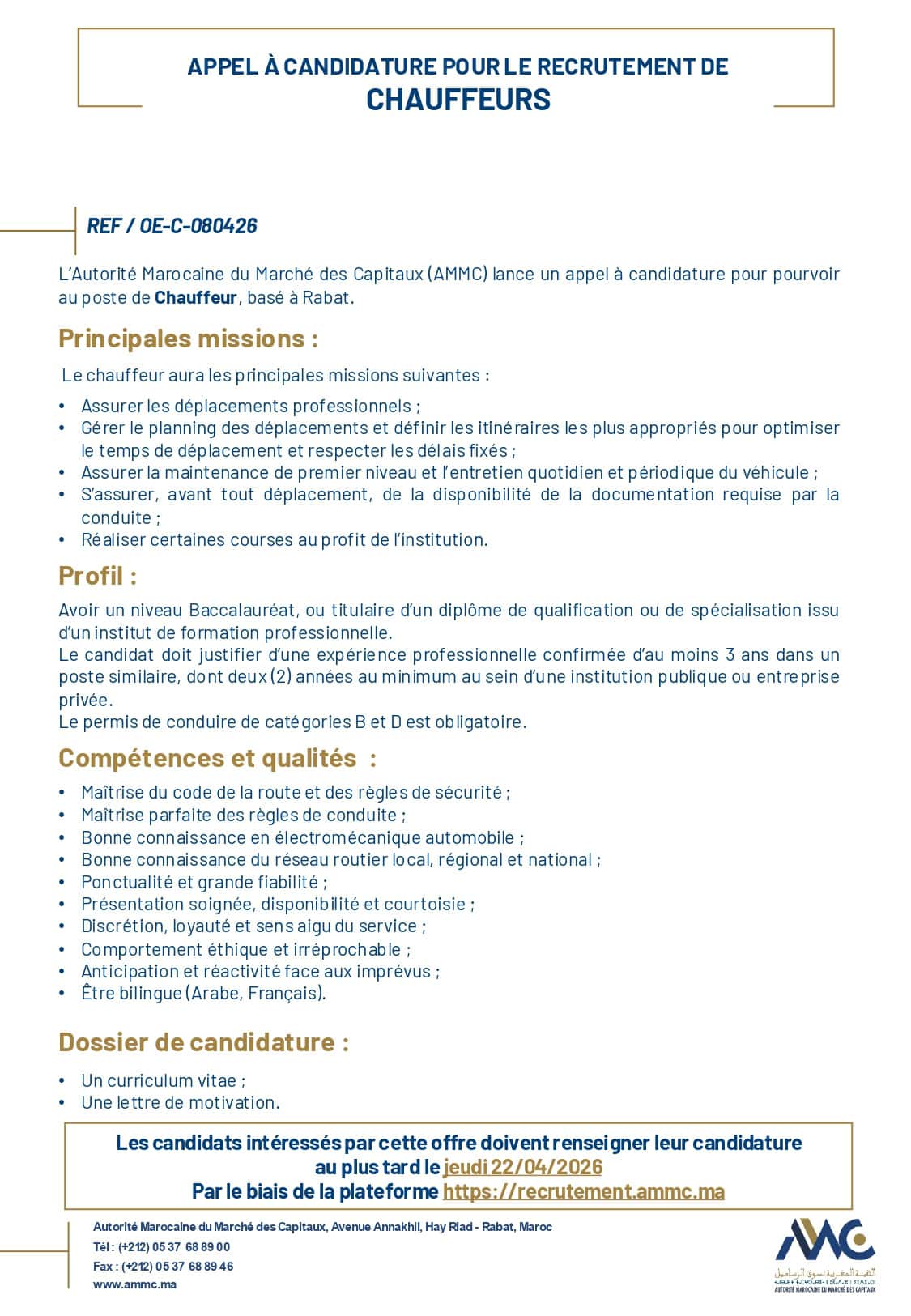 تُقدم AMMC في Maroc فرص عمل حضورية في مقرها. لم يُذكر في الوصف الوظيفي أن أيًا من المناصب (سائقي، مساعدي، مُحللي OPCVM) تُقدَّم بشكل عن بُعد. يُنصح بالتأكيد على طبيعة العمل في الوثائق الرسمية المُقدمة.