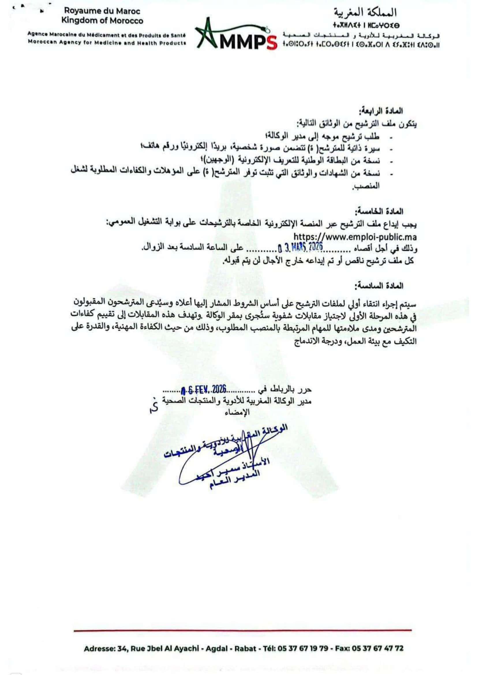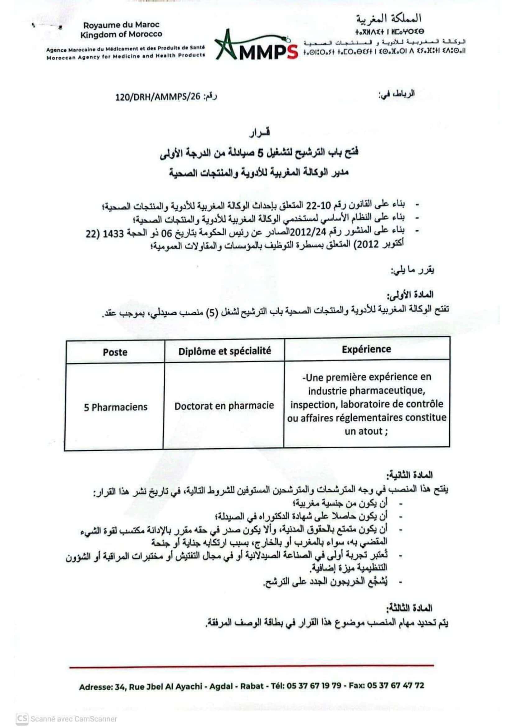 L'Agence Marocaine des Médicaments et des Produits de Santé (AMMPS) organise un concours pour le recrutement de 5 Pharmaciens 1er Grade. Le dernier délai pour postuler est fixé au 3 Mars 2026.