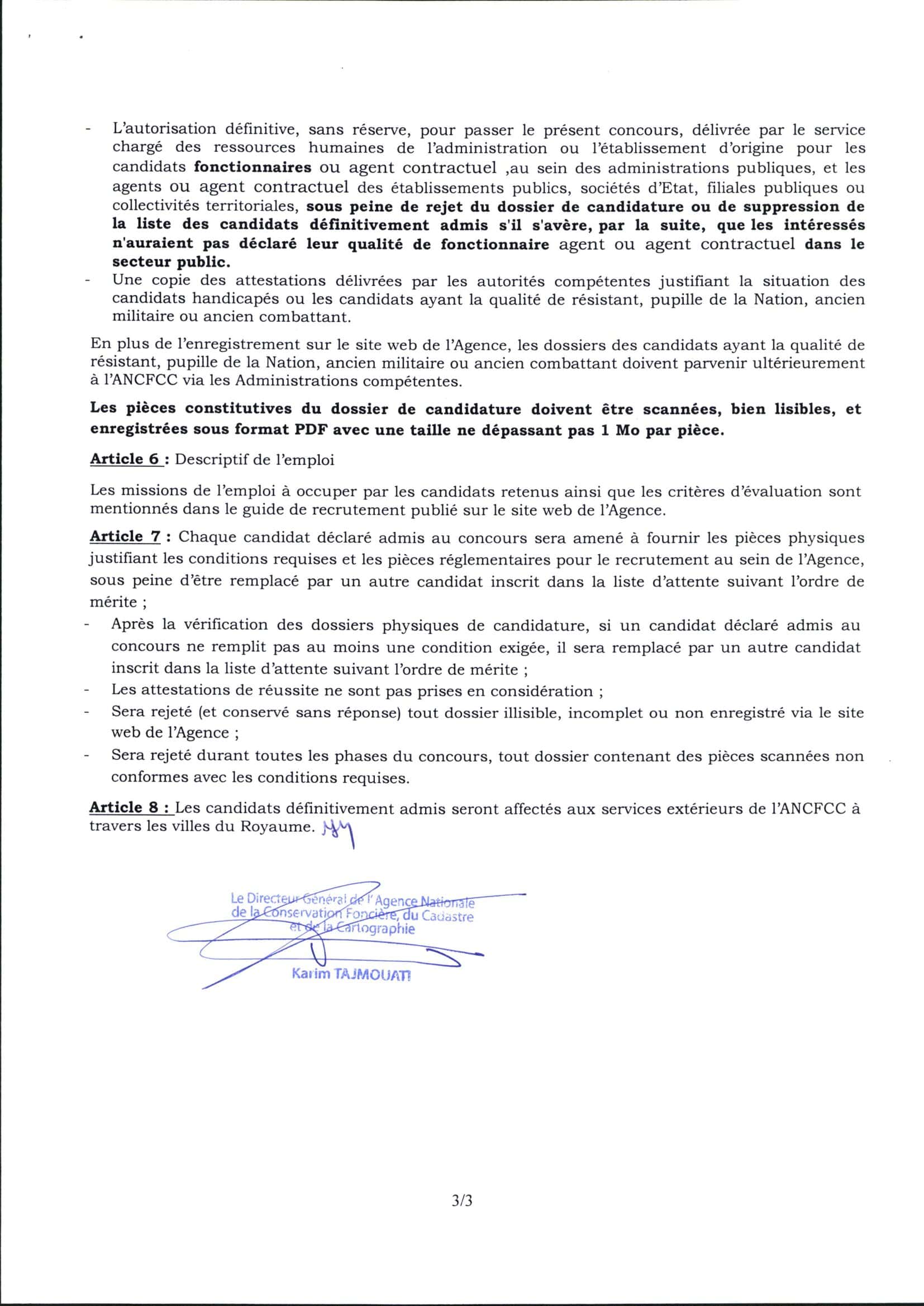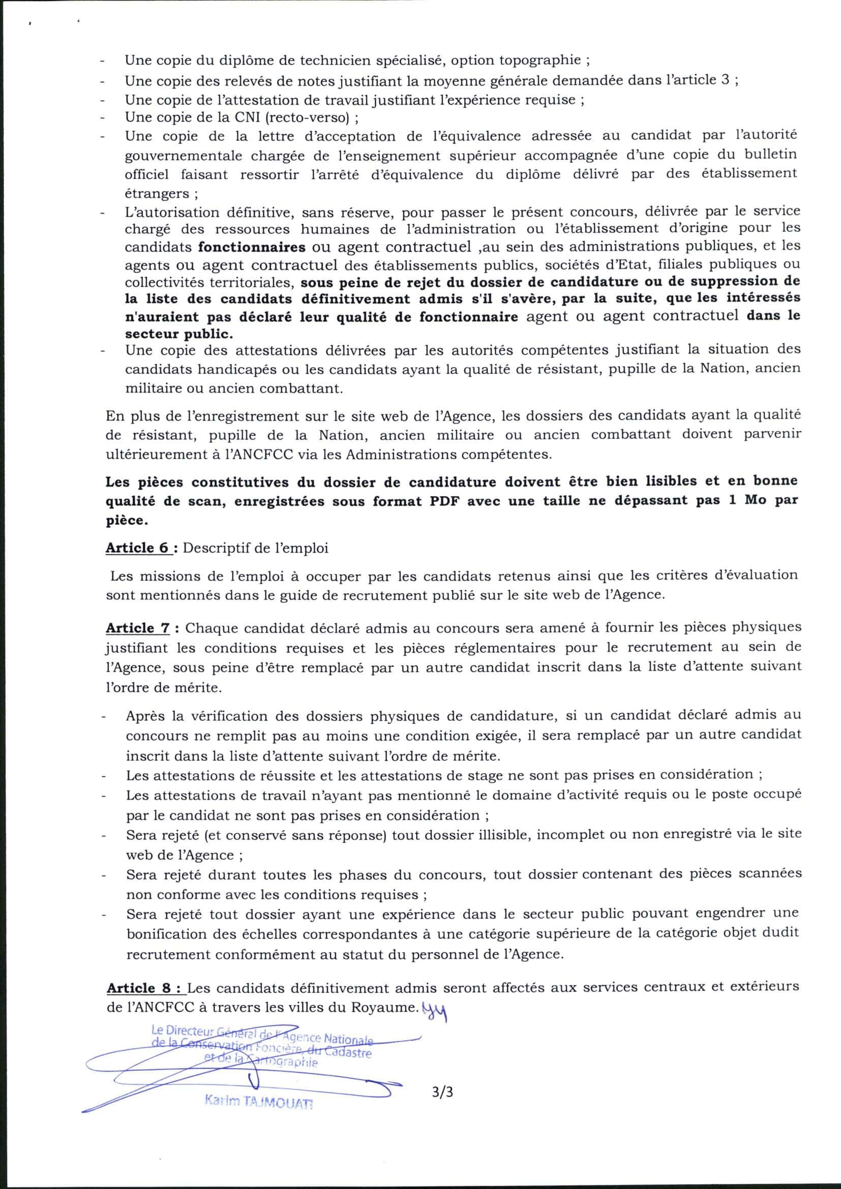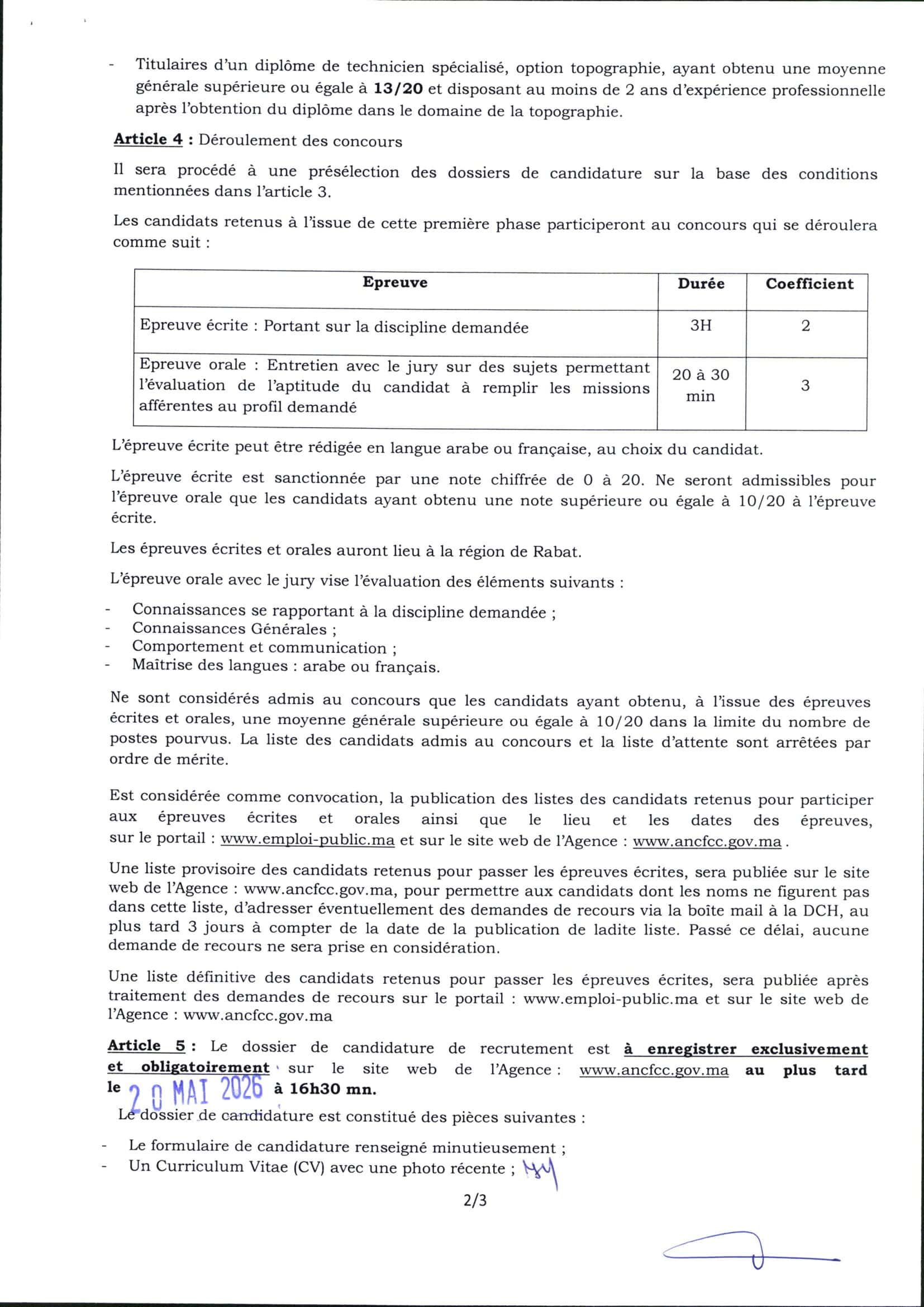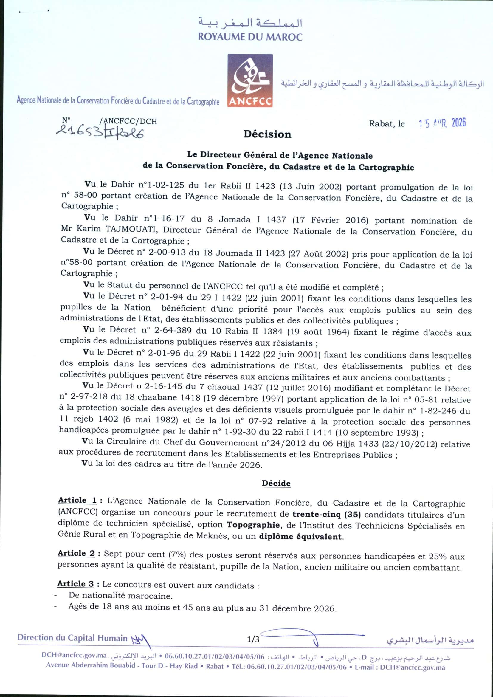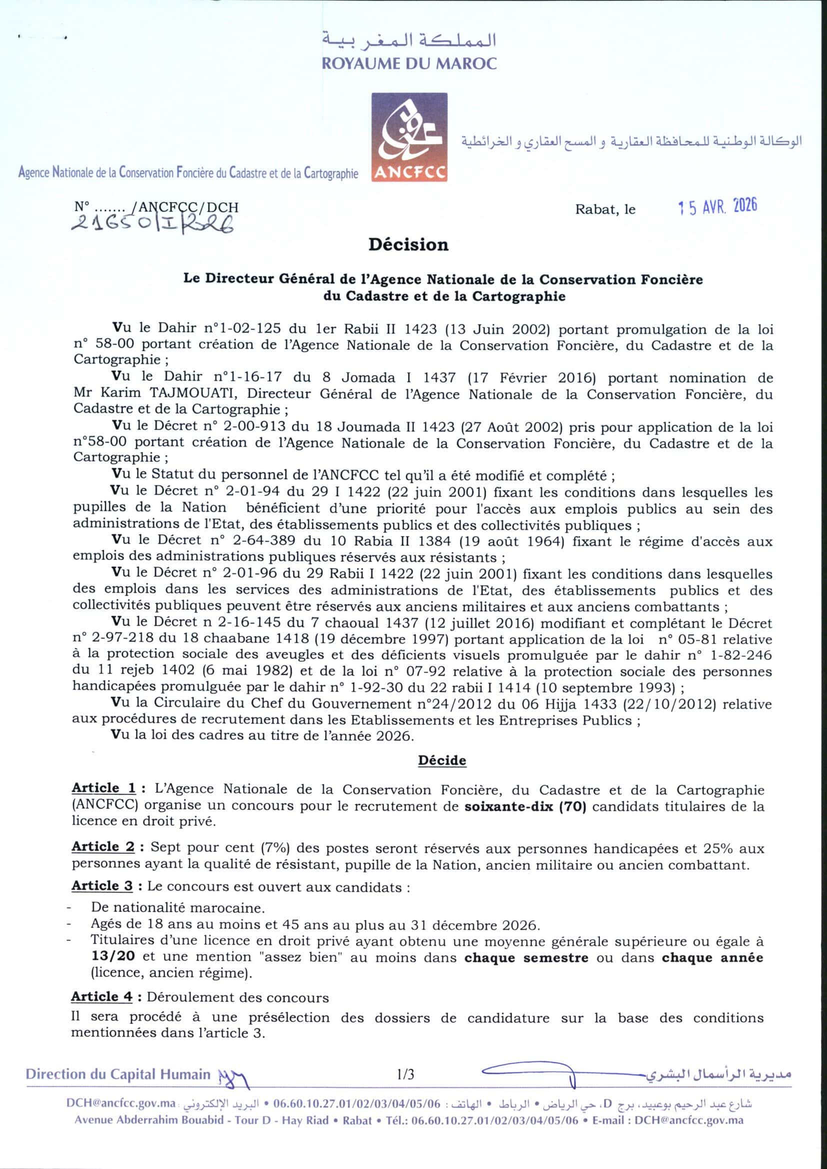 L'Agence Nationale de la Conservation Foncière, du Cadastre et de la Cartographie (ANCFCC) organise un concours pour le recrutement de 105 postes répartis comme suit :