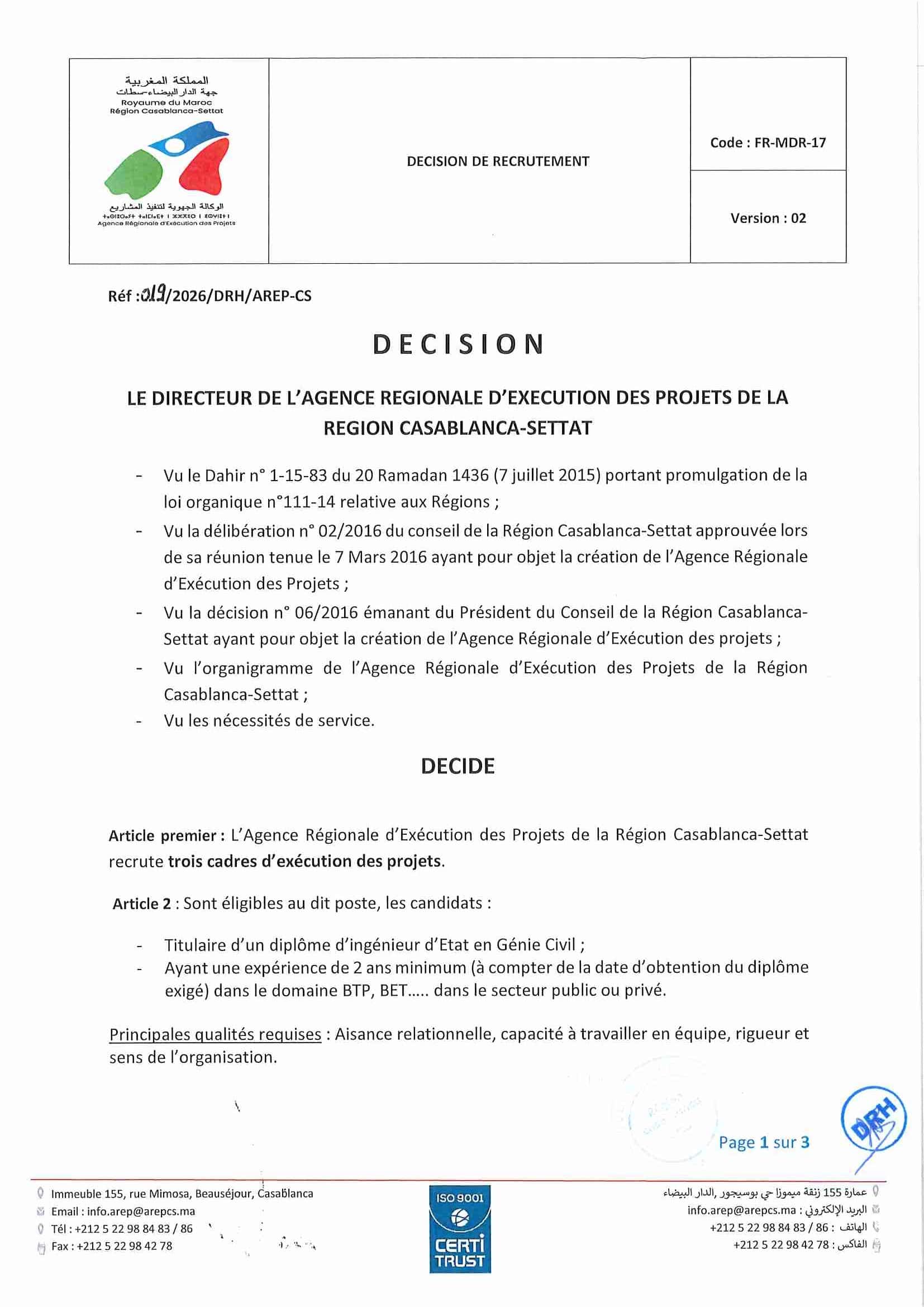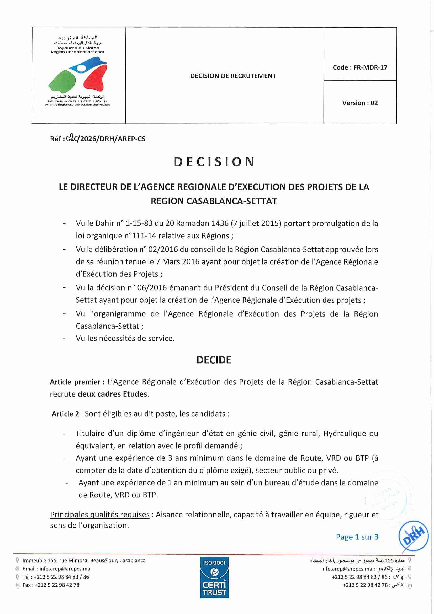 L'Agence Régionale d'Exécution des Projets (AREP) de Casablanca Settat organise un concours pour le recrutement de 5 postes répartis comme suit :