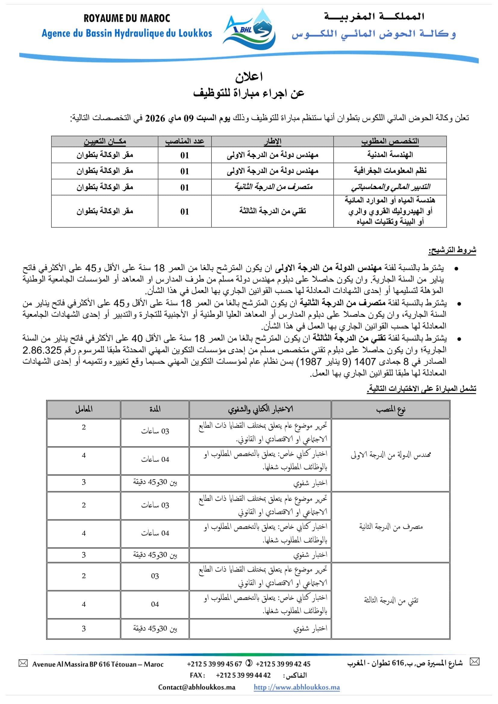 Concours de Recrutement Agence du Bassin Hydraulique du Loukkos 2026 (4 Postes)