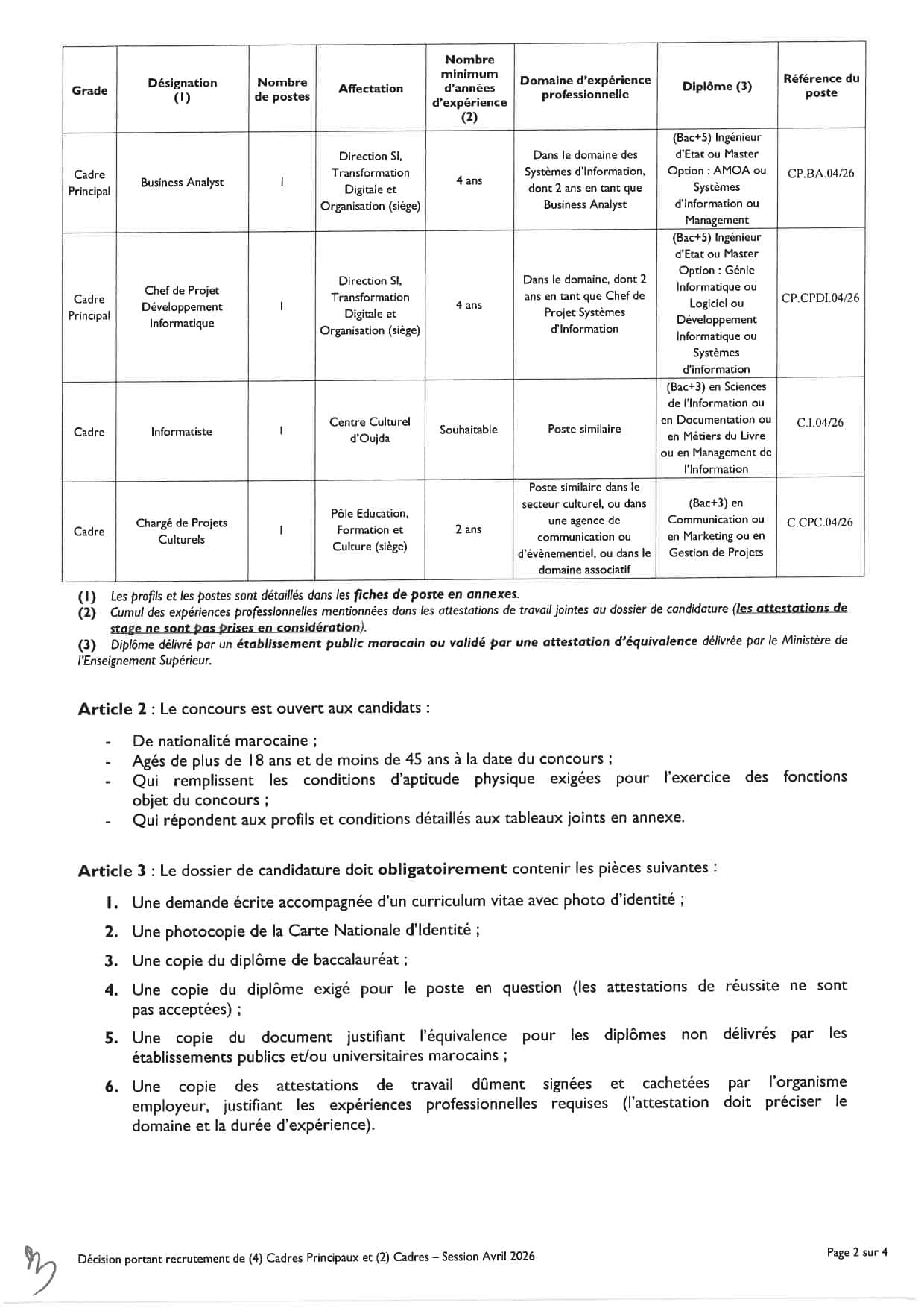 Documents requis: Curriculum vitae, copie de la CNI, diplômes, attestations de travail/stage, document d'équivalence pour les diplômes étrangers.
