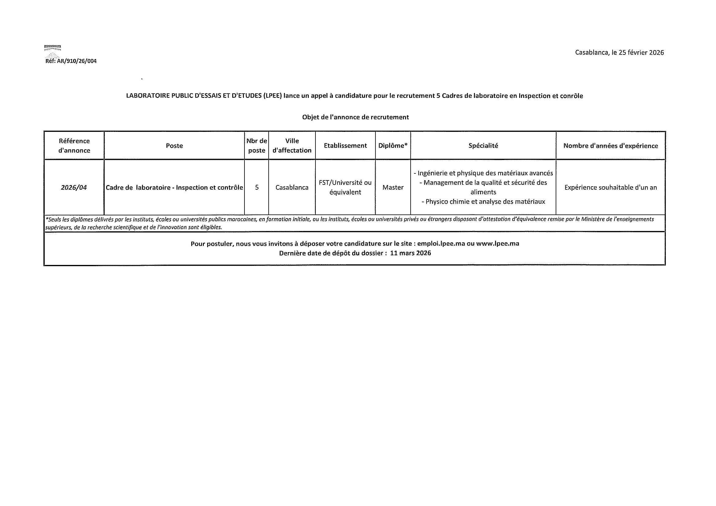 Le Laboratoire Public d’Essais et d’Études (LPEE) ouvre un concours de recrutement pour 5 postes de Cadres de laboratoire en inspection et contrôle, basés à Casablanca. Ces contrats statutaires s'adressent à des candidats titulaires d'un Master souhaitant travailler dans le domaine du contrôle technique et de l'analyse des matériaux.
