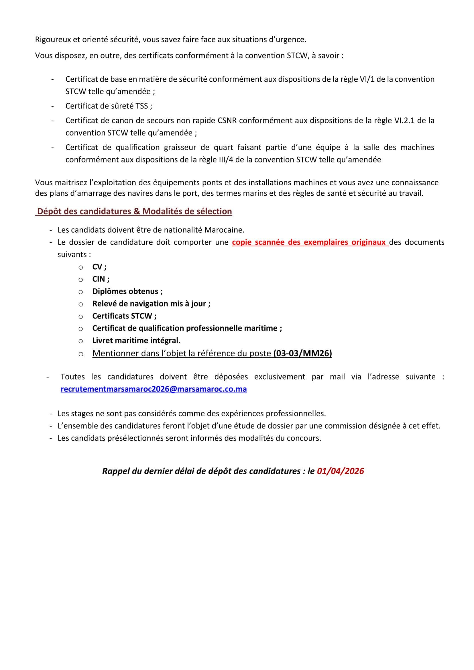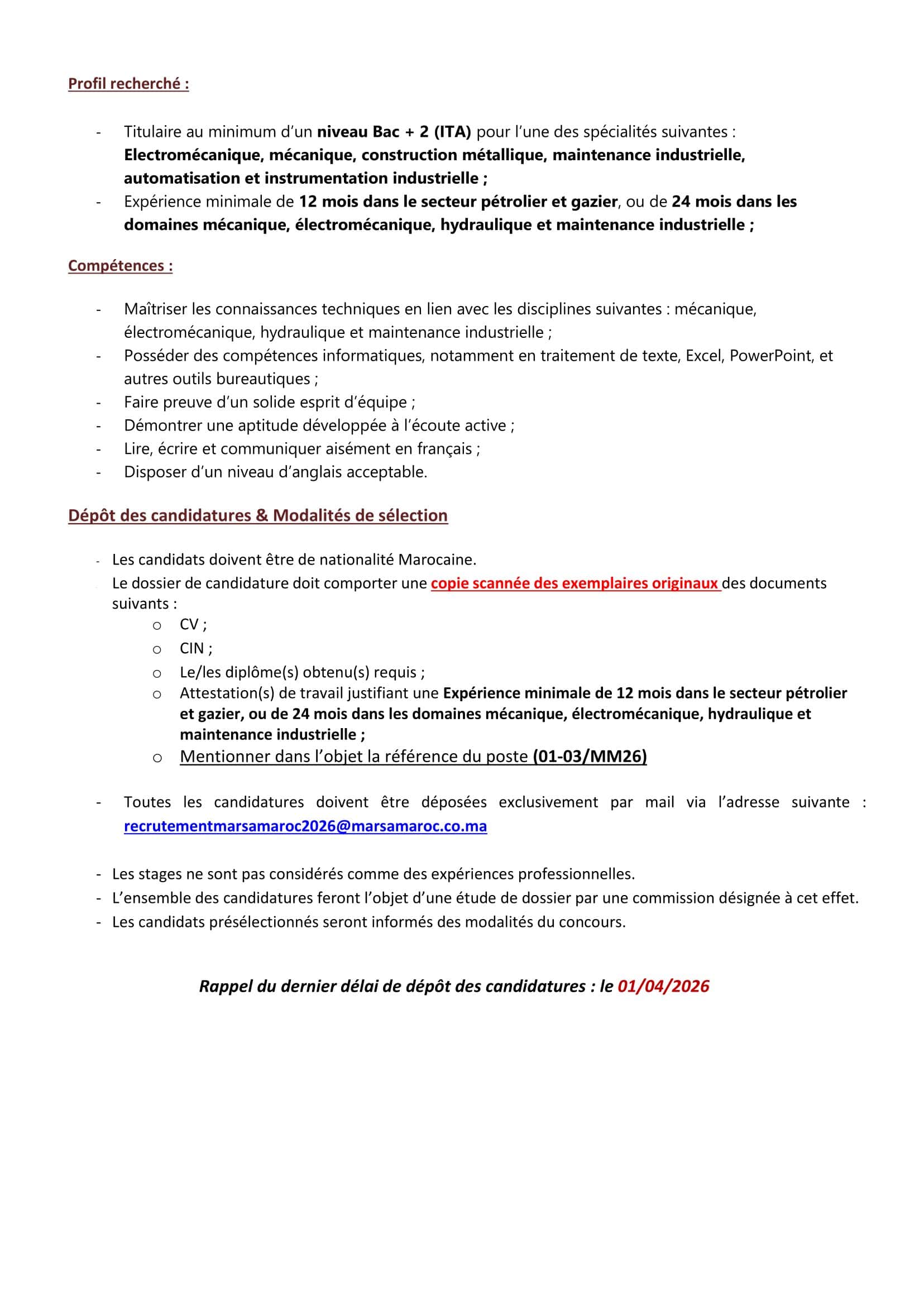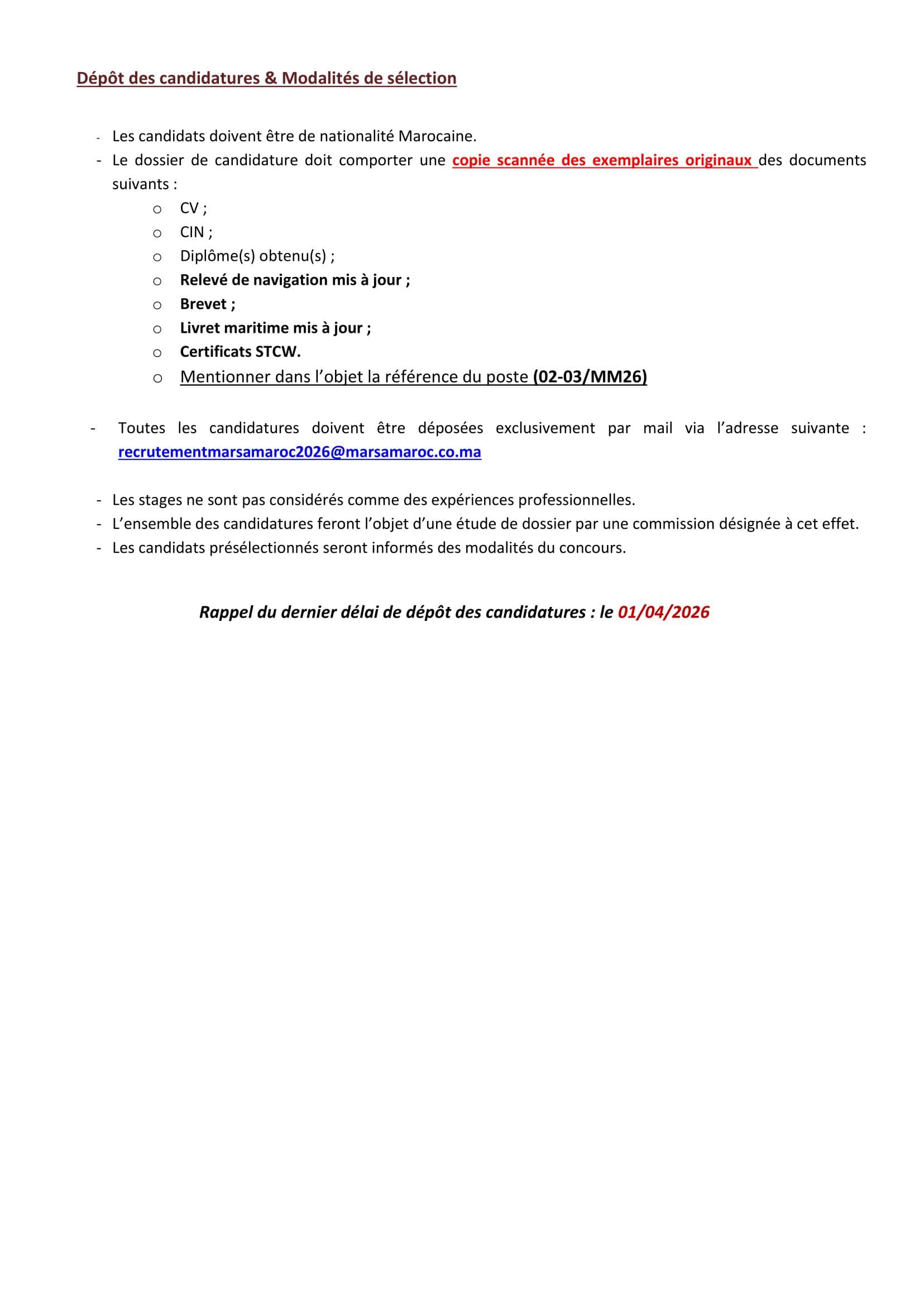 Adresse de candidature: recrutementmarsamaroc2026@marsamaroc.co.ma