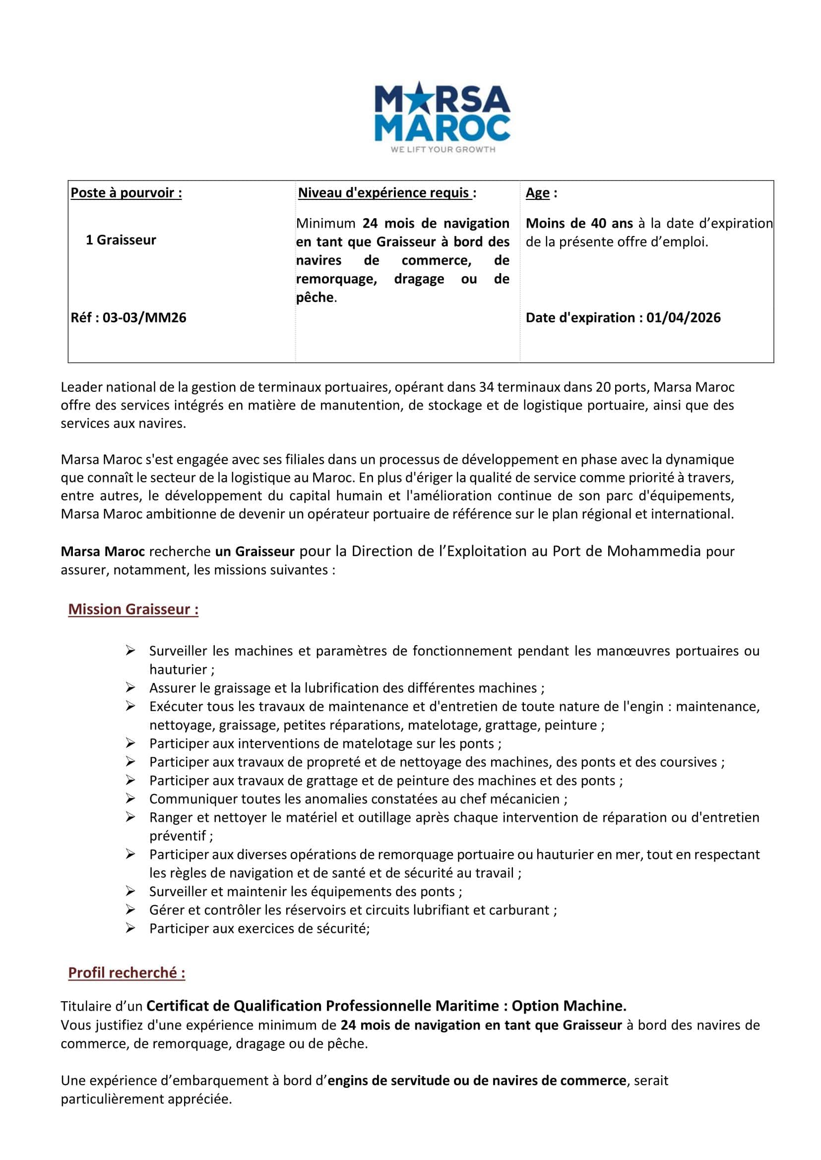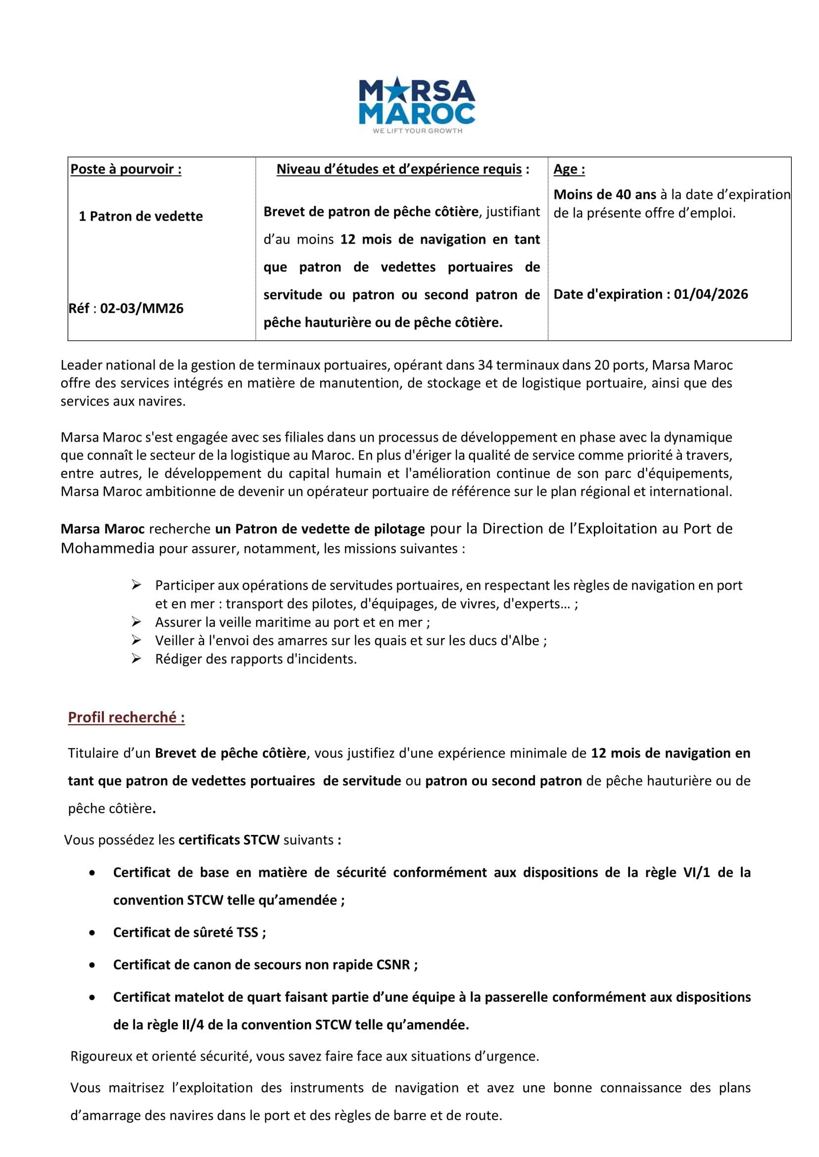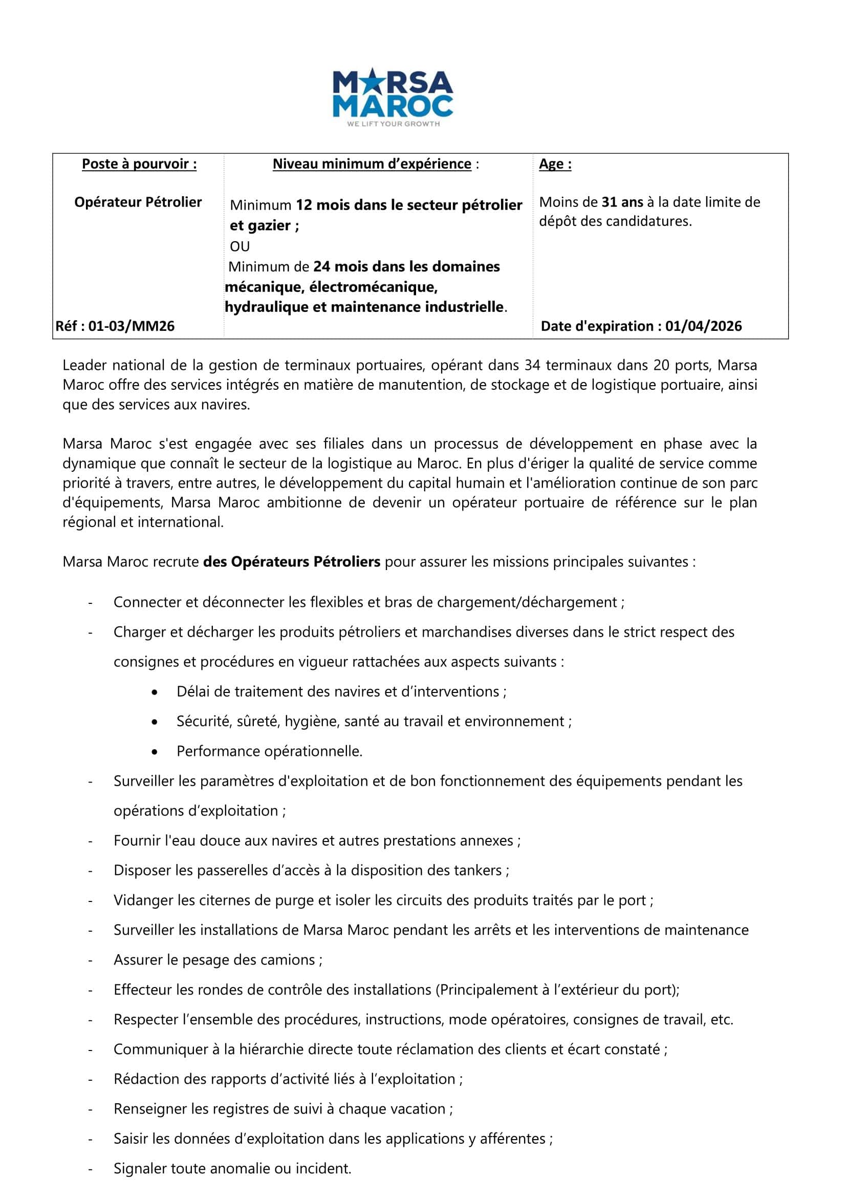Adresse de candidature: recrutementmarsamaroc2026@marsamaroc.co.ma