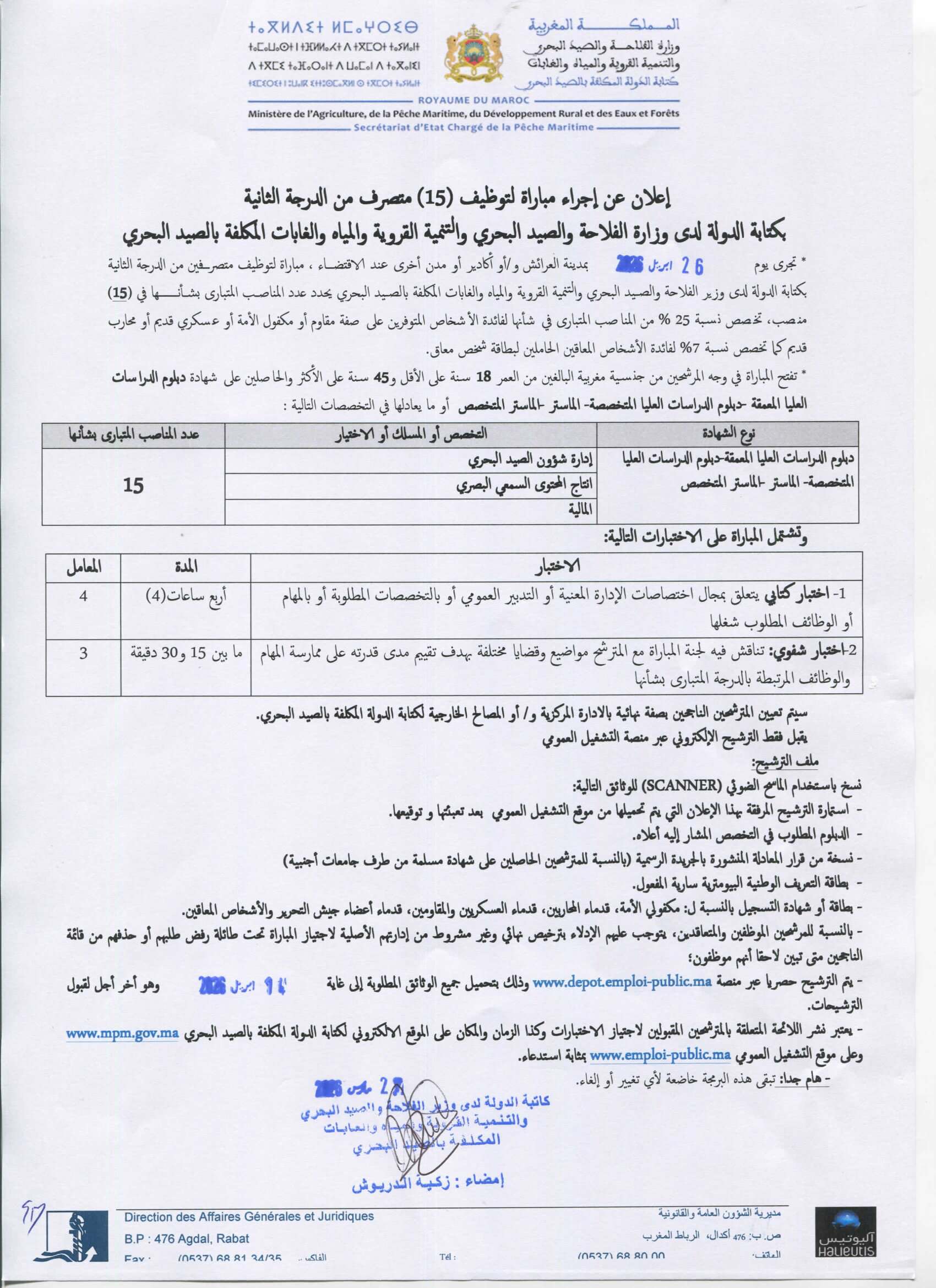 Le Ministère de l’Agriculture, de la Pêche Maritime, du Développement Rural et des Eaux et Forêts (MAPMDREF) organise un concours pour le recrutement de 25 postes :