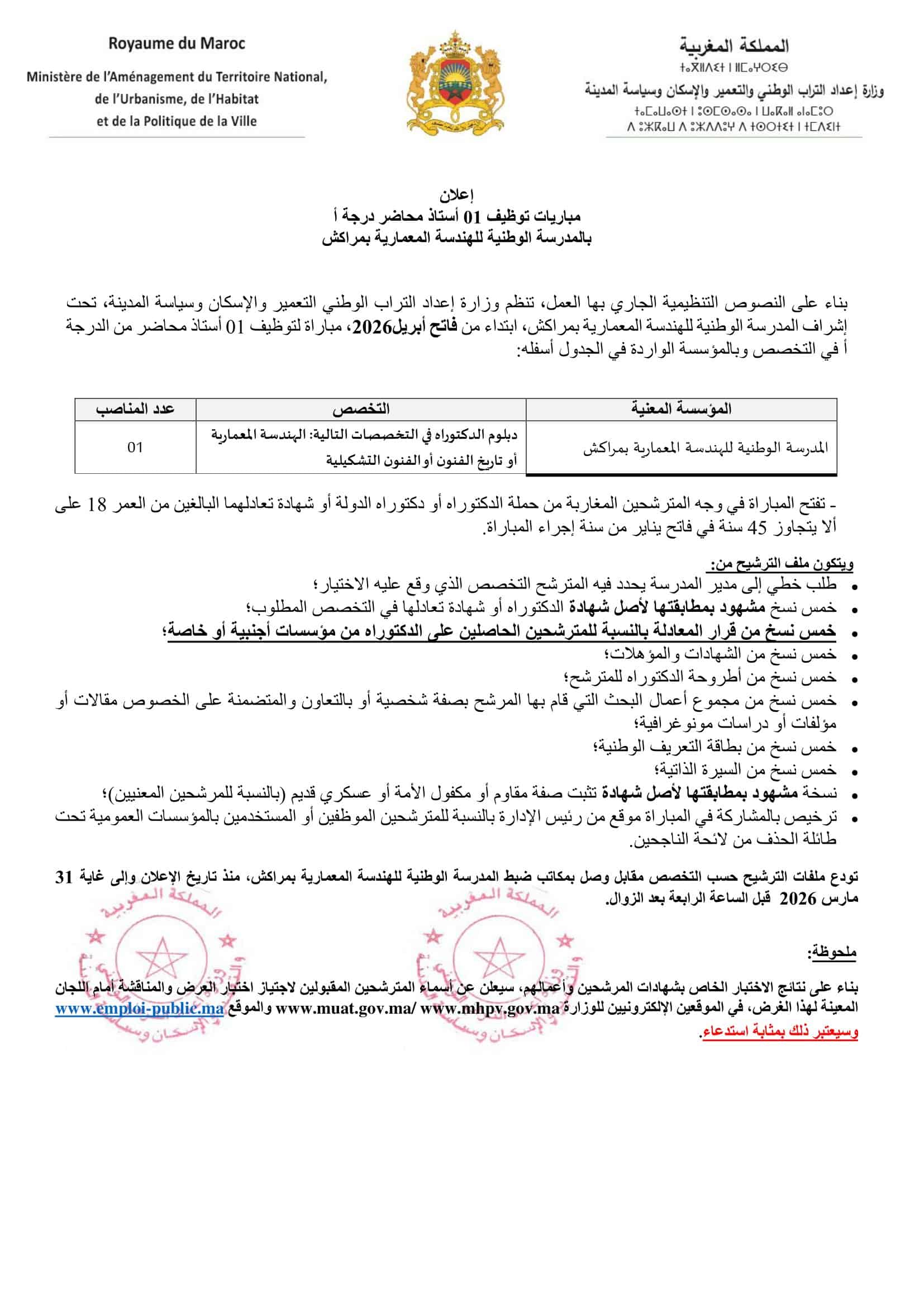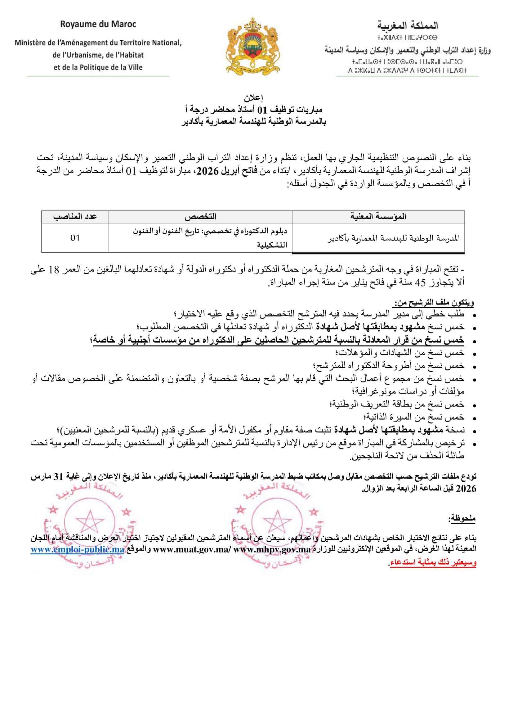 Le Ministère de l’Aménagement du Territoire National, de l’Urbanisme, de l’Habitat et de la Politique de la Ville organise un concours pour le recrutement de 5 Maîtres de Conférences.