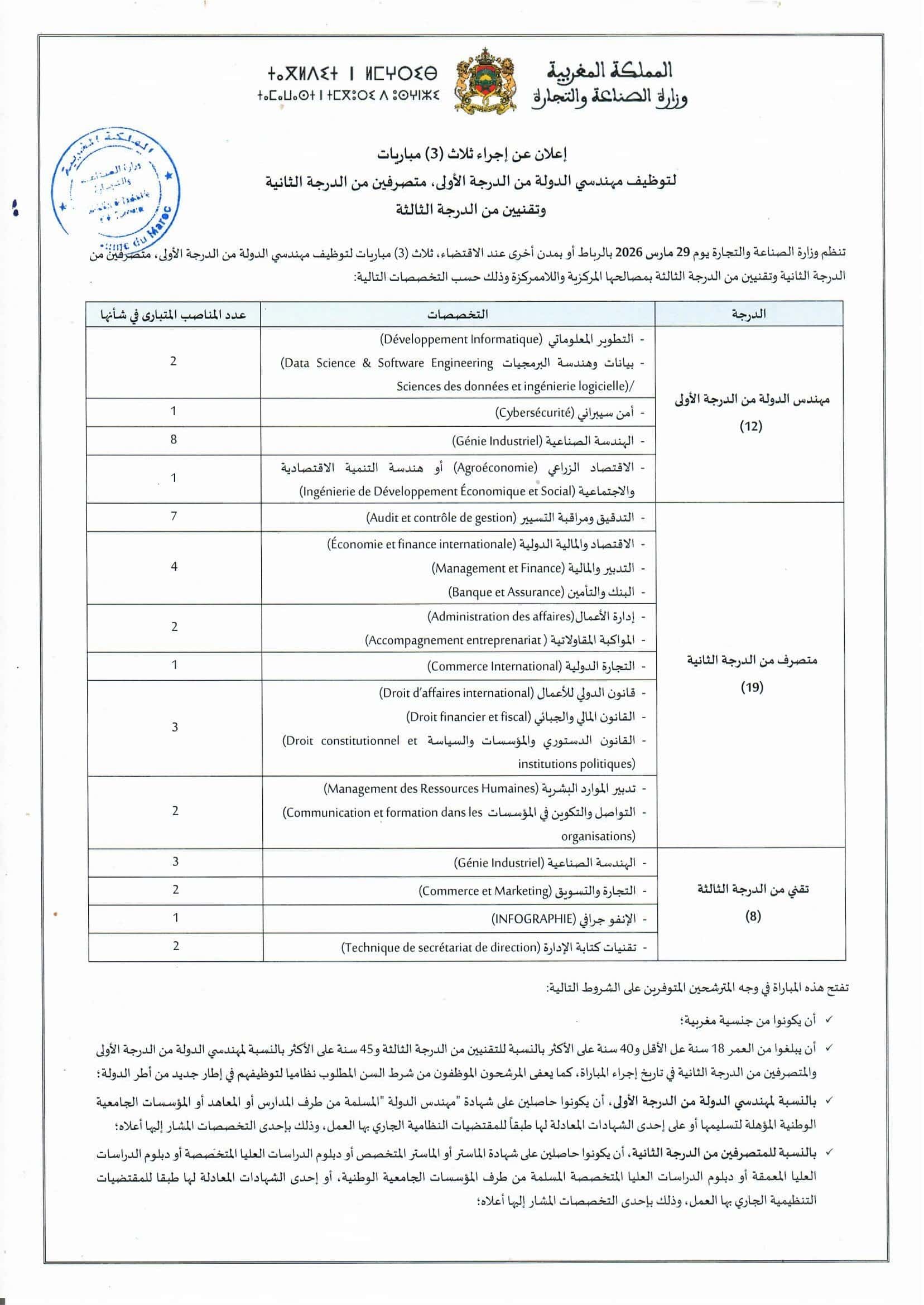 Le Ministère de l'Industrie et du Commerce organise un concours pour le recrutement de 39 postes en 2026. Les postes sont répartis comme suit :