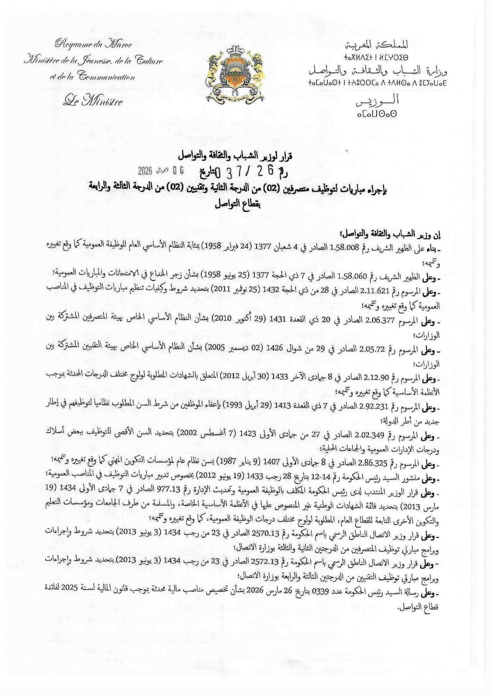 Le Ministère de la Jeunesse, de la Culture et de la Communication, Département de la Communication, organise un concours pour le recrutement de 6 postes répartis comme suit :