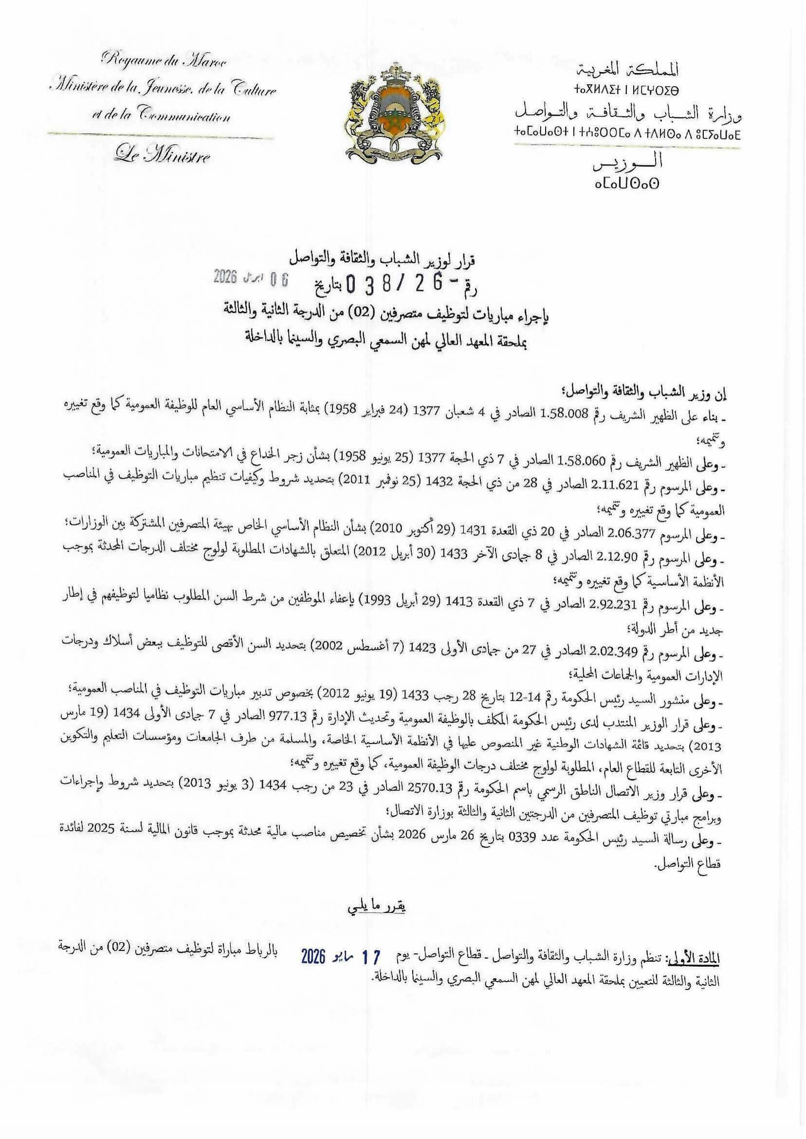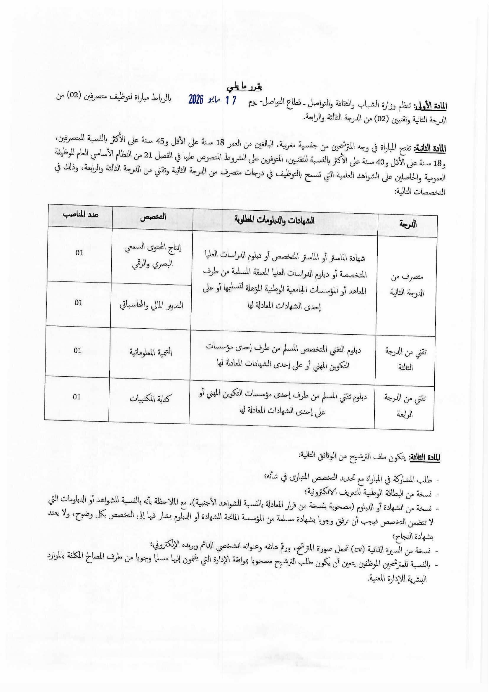 La date limite de dépôt des candidatures est fixée au 23 Avril 2026. Le concours se tiendra le 17 Mai 2026.