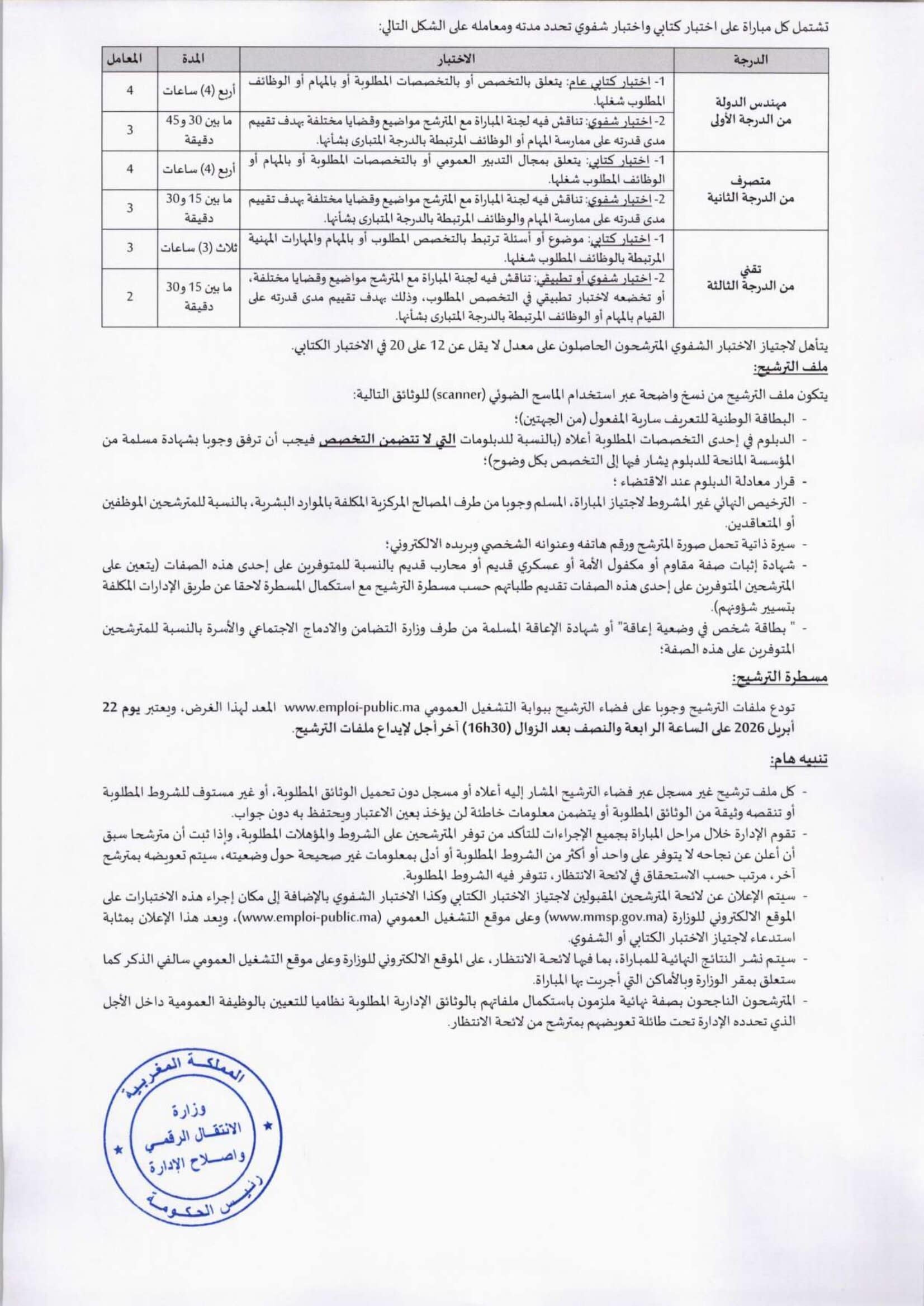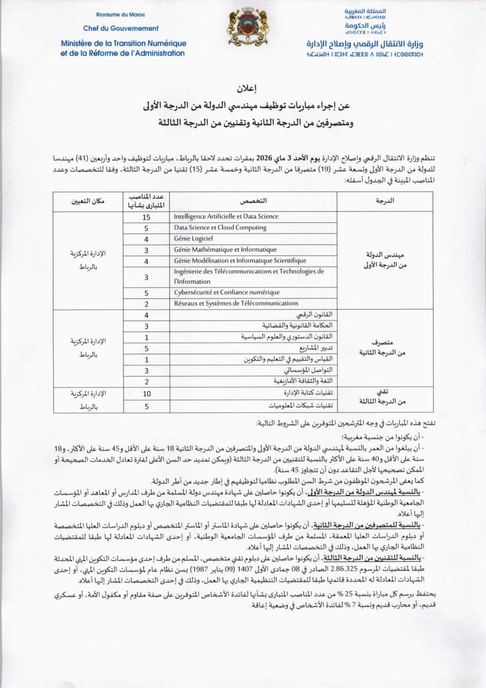 تُركّز الوزارة على إصلاح الإدارة العامة وتحفيز الانتقال الرقمي في المغرب. تتضمن فرص العمل 41 مهندسًا، 19 مشرفًا إداريًا، و15 تقنيًا. جميع المناصب مرتبطة بالنظام الحكومي الثابت (CDI) وتقام اختبارات التوظيف في 3 مايو 2026.