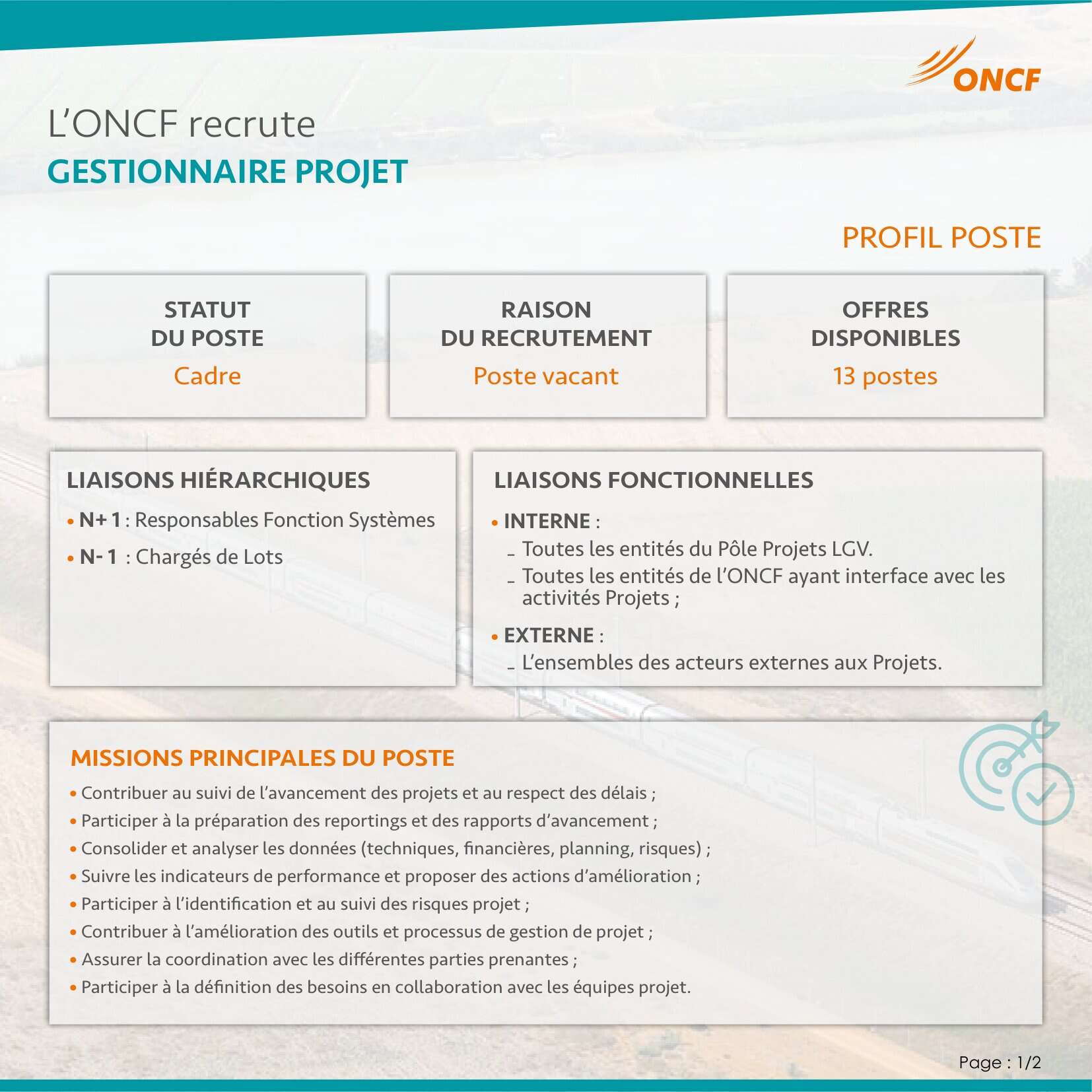 L'Office National des Chemins de Fer (ONCF) lance un concours pour le recrutement de 13 Gestionnaires Projet à Rabat, en CDI. Les candidats doivent être titulaires d'un diplôme d'Ingénieur d'État en Génie Électrique et souhaiter évoluer dans le pilotage et le suivi de projets ferroviaires.