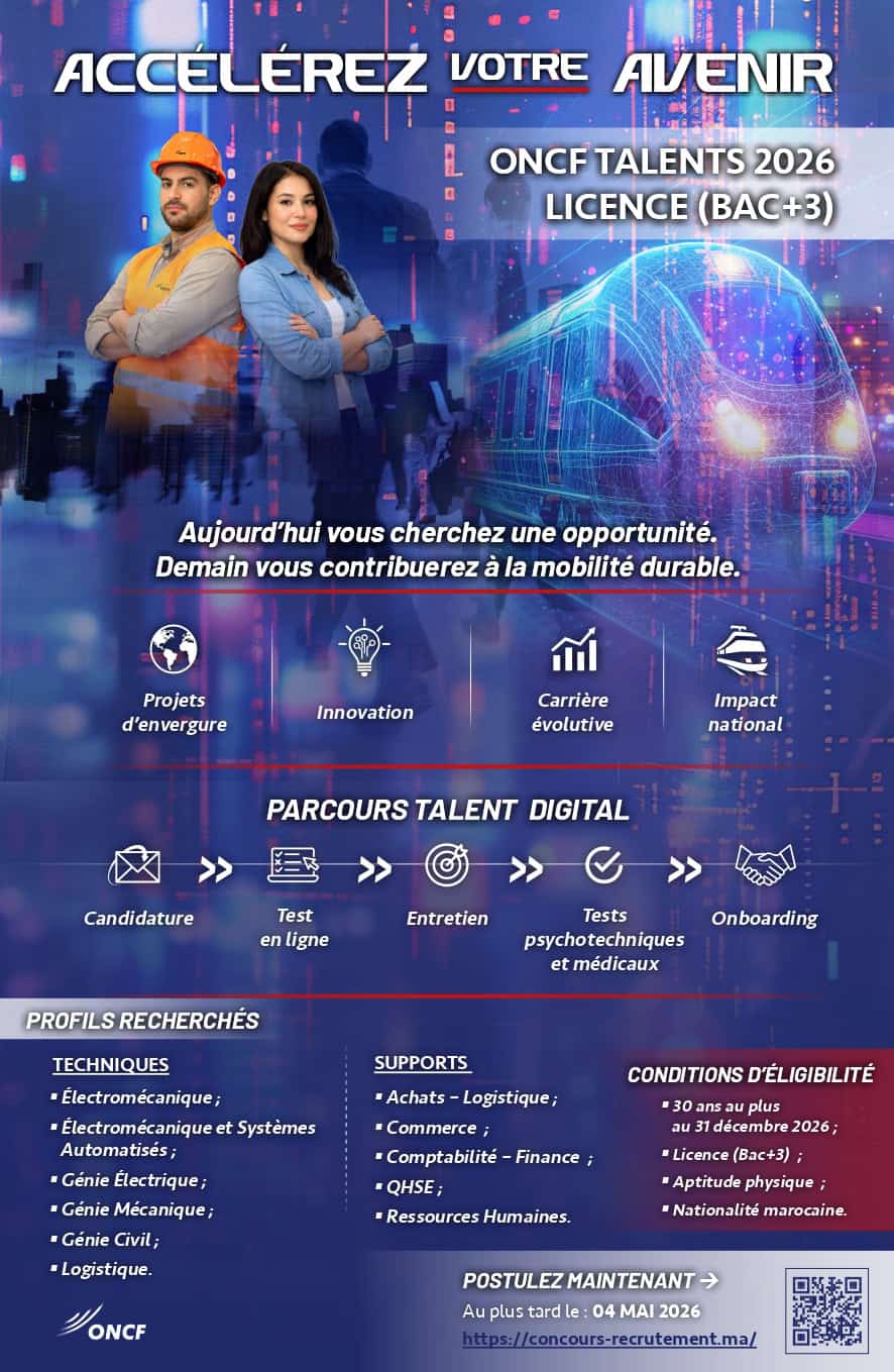 L'Office National des Chemins de Fer (ONCF) organise un concours pour le recrutement de 140 Encadrants. La date limite pour postuler est fixée au 4 Mai 2026.
