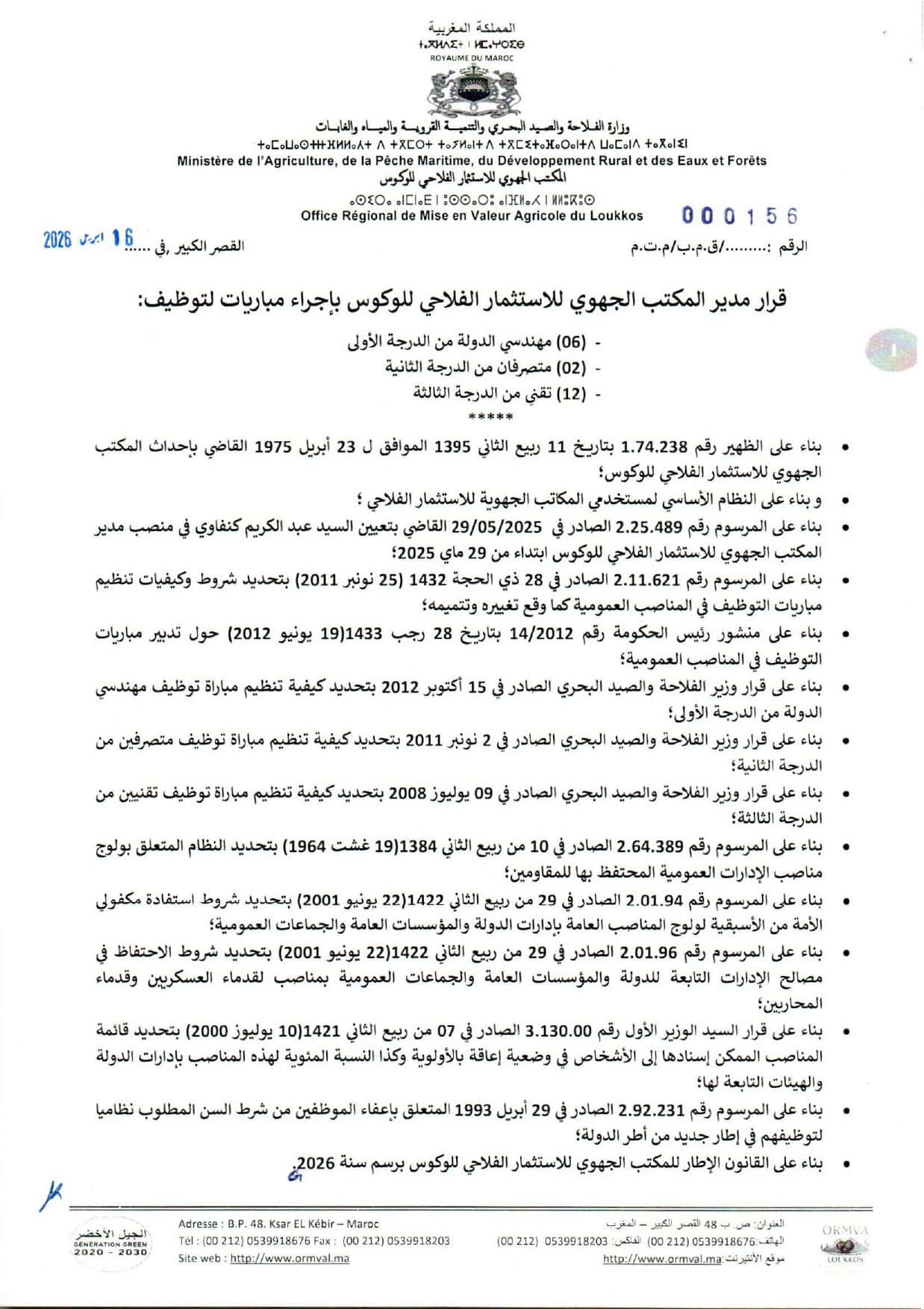L'Office Régional de Mise en Valeur Agricole du Loukkos (ORMVAL) organise un concours pour le recrutement de 20 postes répartis comme suit :