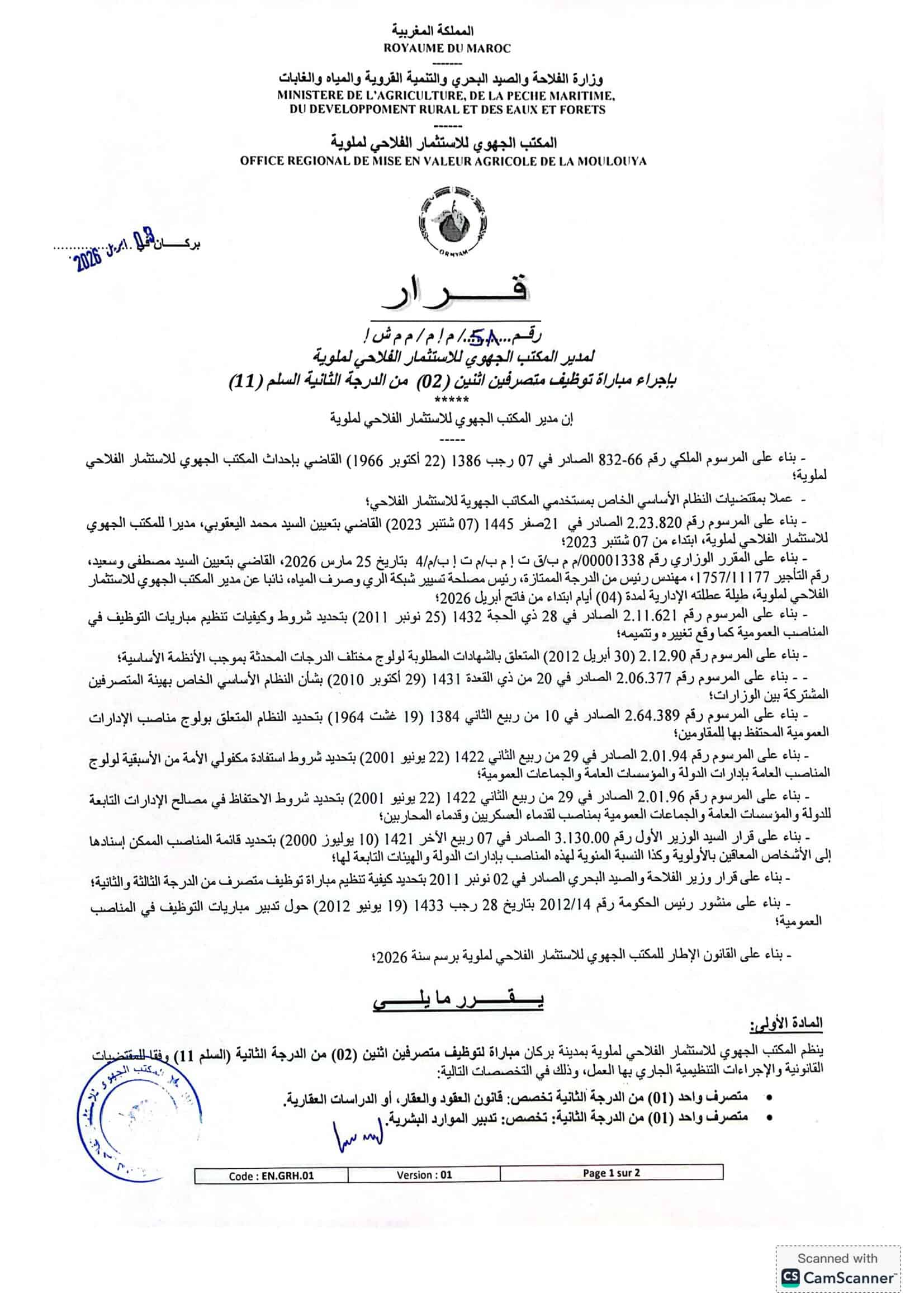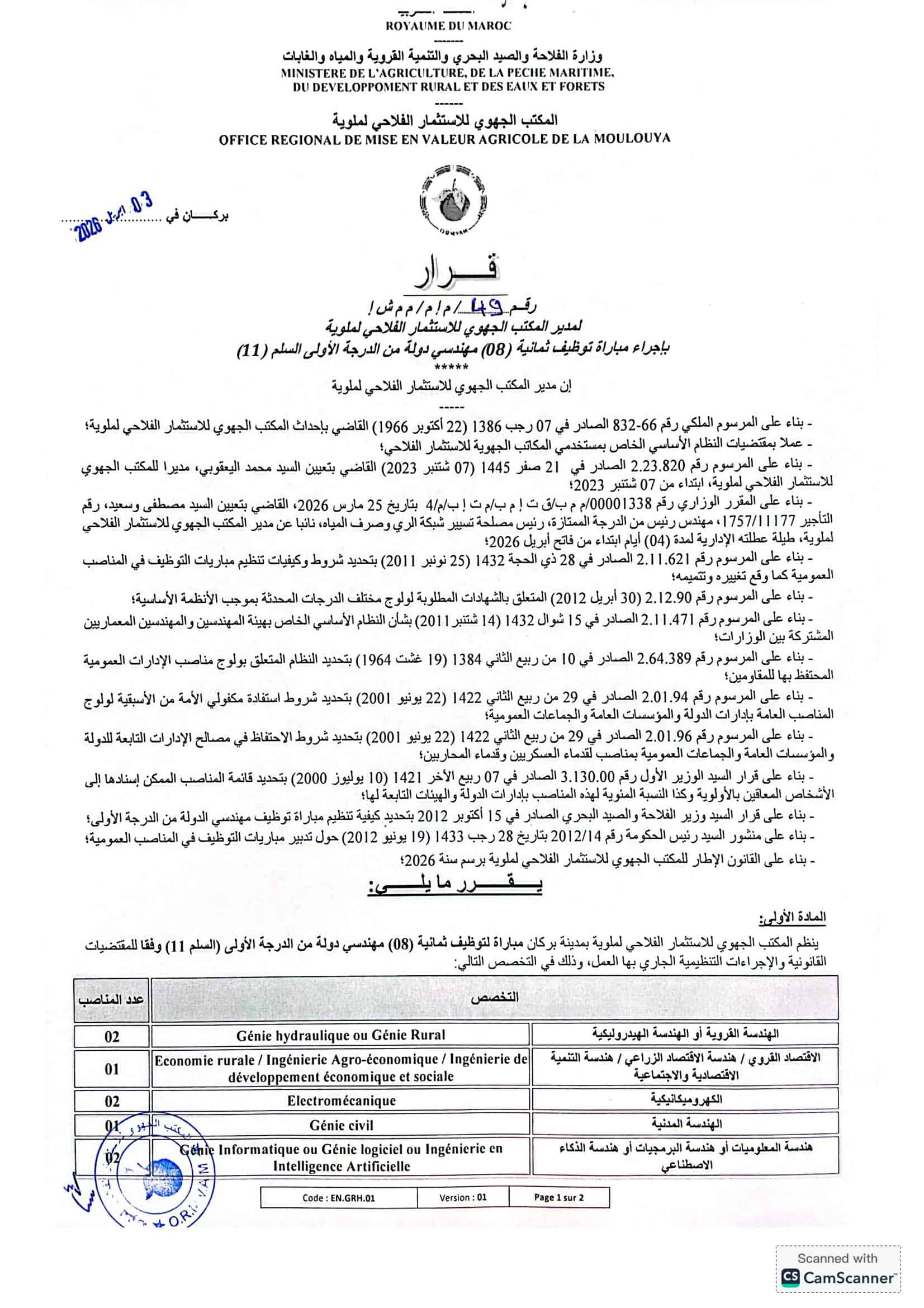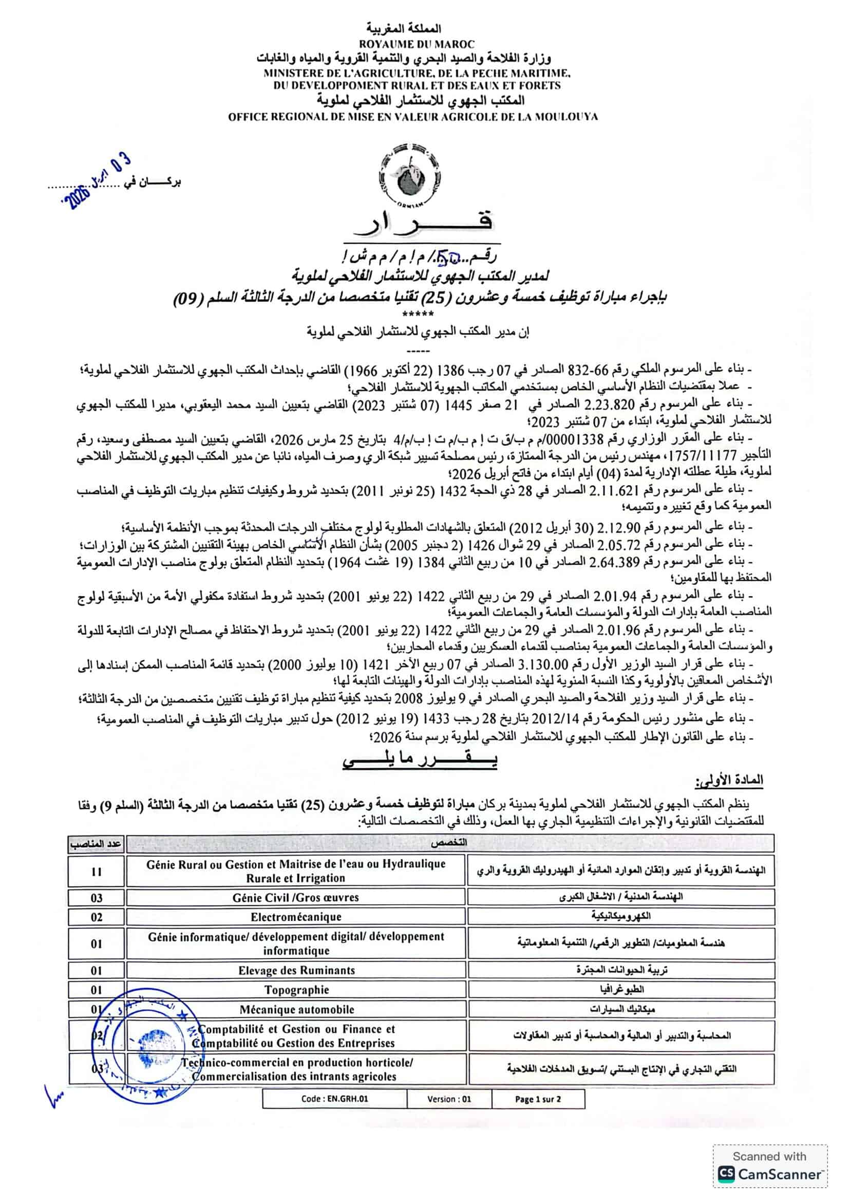 L'Office Régional de Mise en Valeur Agricole de la Moulouya (ORMVAM) lance un concours pour le recrutement de 35 postes répartis comme suit: