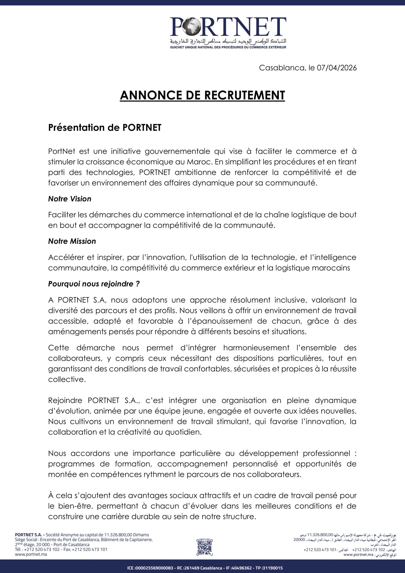 Mode de candidature: Envoyer les documents par email à recrutement@portnet.ma