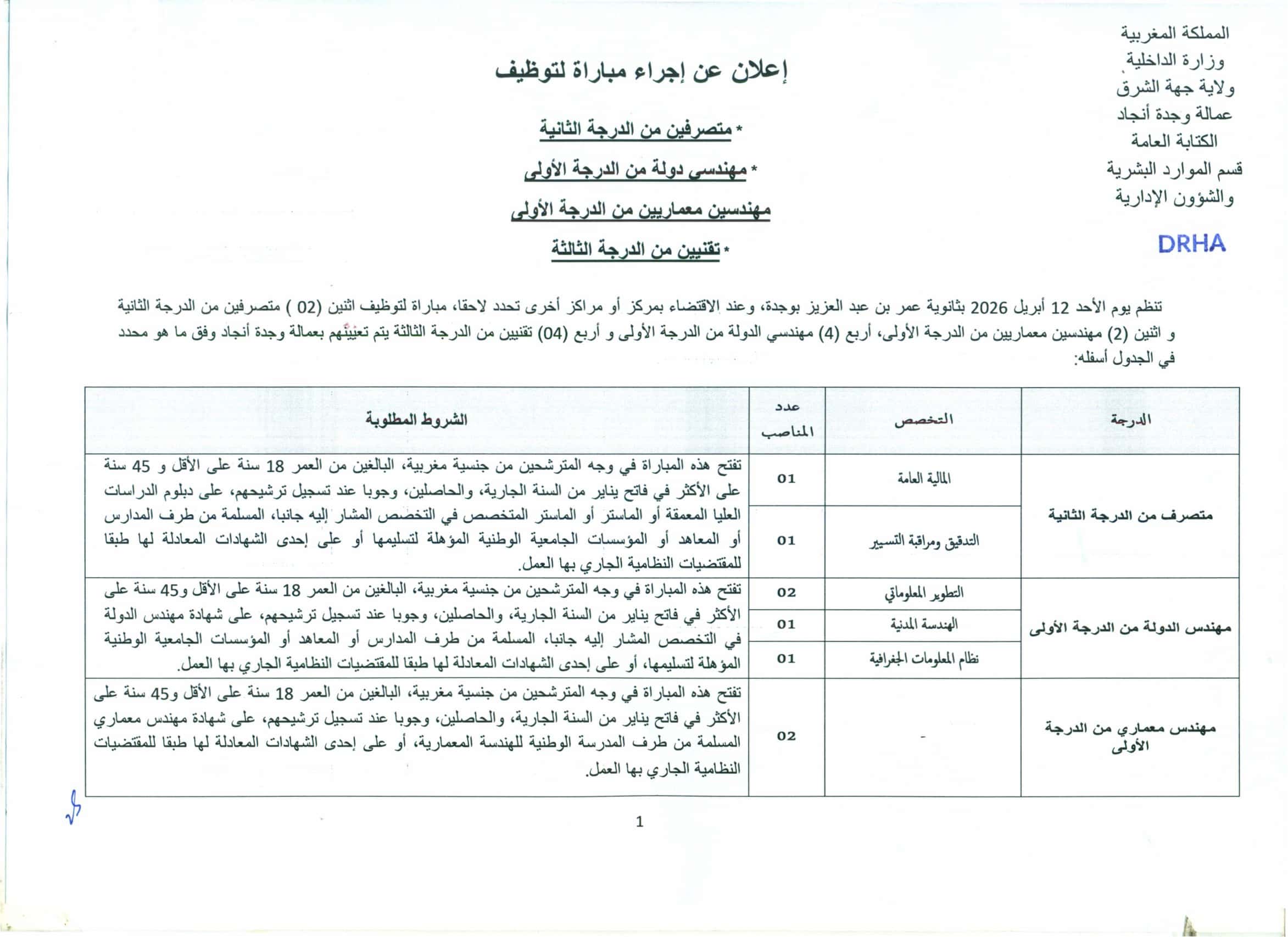 Concours de Recrutement Préfecture Oujda Angad 2026 (12 Postes)