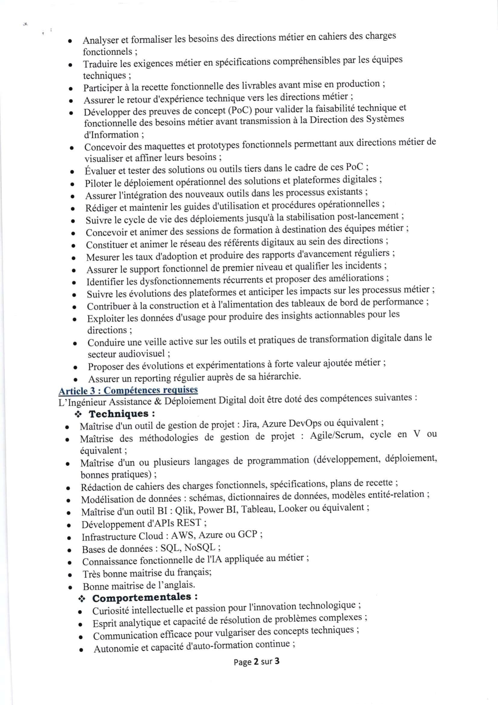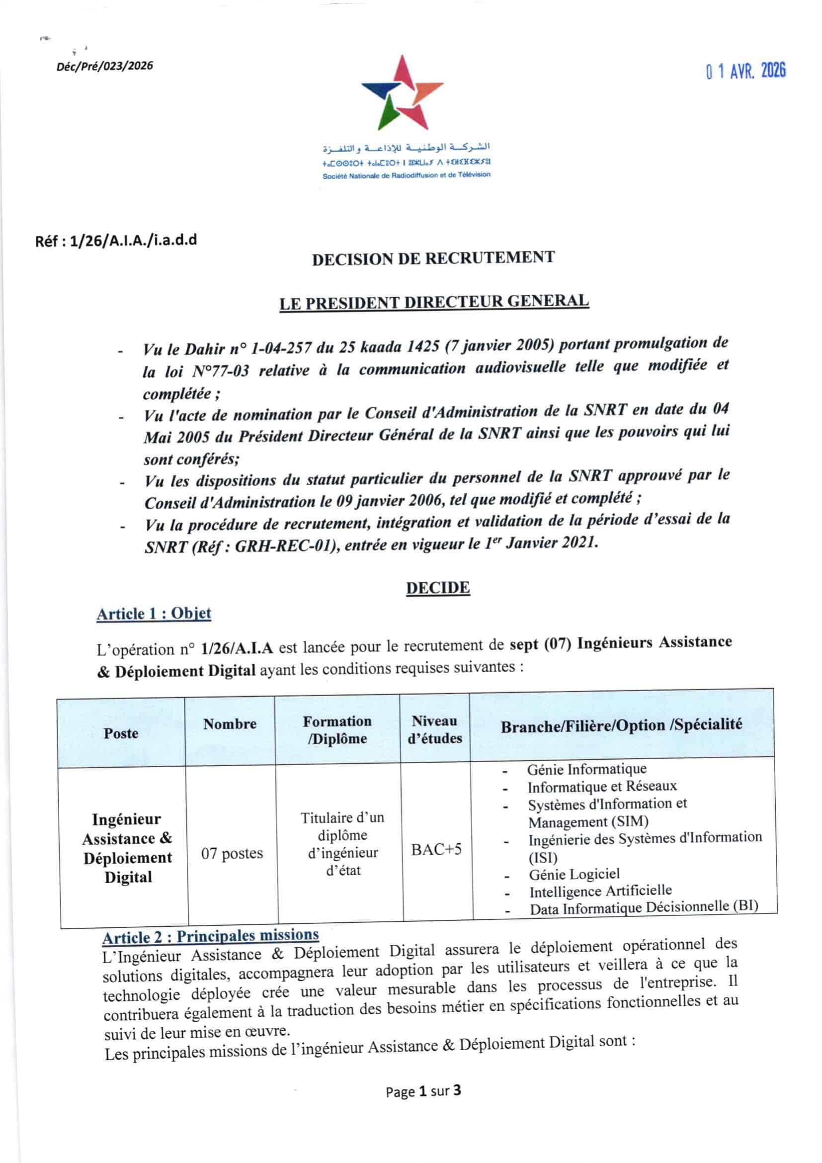 La Société Nationale de Radiodiffusion et de Télévision (SNRT) lance un concours de recrutement pour 7 ingénieurs Assistance & Déploiement Digital. Le dernier délai pour postuler est fixé au 16 avril 2026.