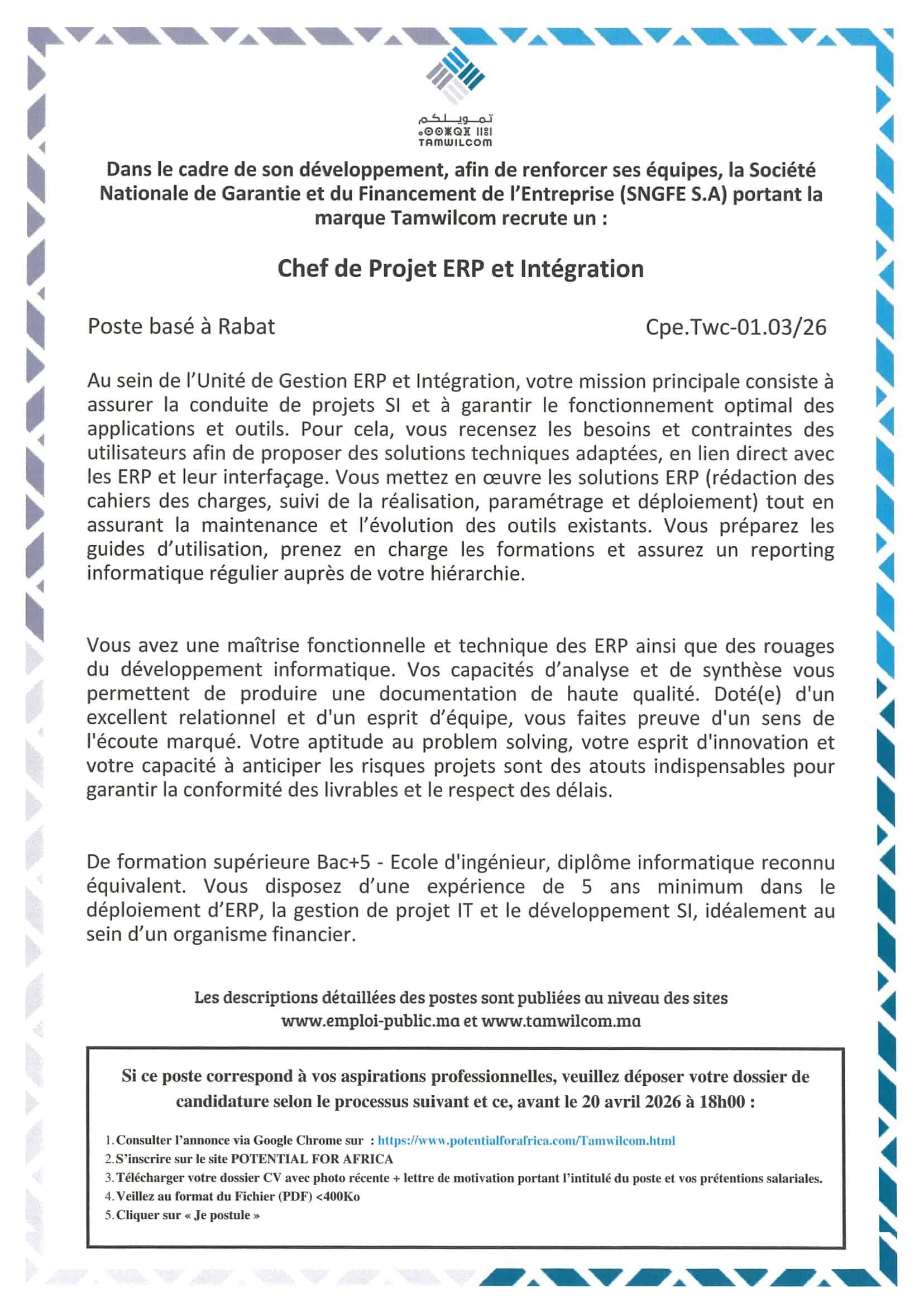 Le dernier délai pour postuler est fixé au 20 avril 2026. Les candidatures doivent être soumises via le lien officiel ci-dessous.