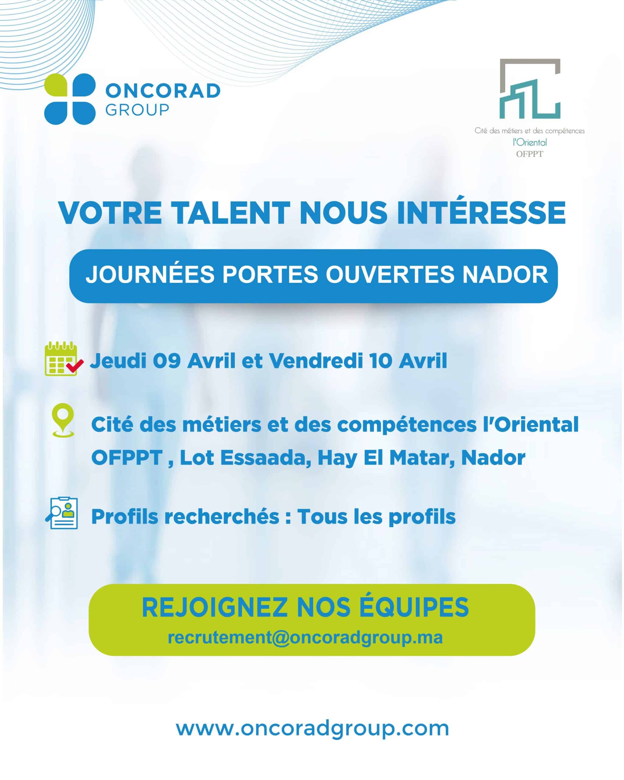 Oncorad Group organise deux journées de recrutement à Nador les 8 et 9 avril 2026 à partir de 10h, à la Cité des Métiers et des Compétences de l'Oriental. Ces événements s'adressent aux professionnels et futurs talents souhaitant évoluer dans le secteur de la santé.