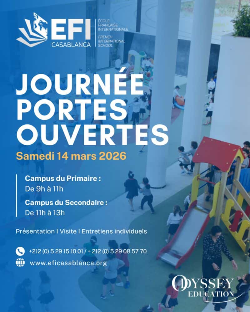 L’École Française Internationale de Casablanca organise une Journée Portes Ouvertes pour son campus primaire et secondaire le samedi 14 mars 2026, de 9h à 13h. Cet événement s'adresse aux familles souhaitant découvrir les programmes éducatifs et les installations de l'établissement.