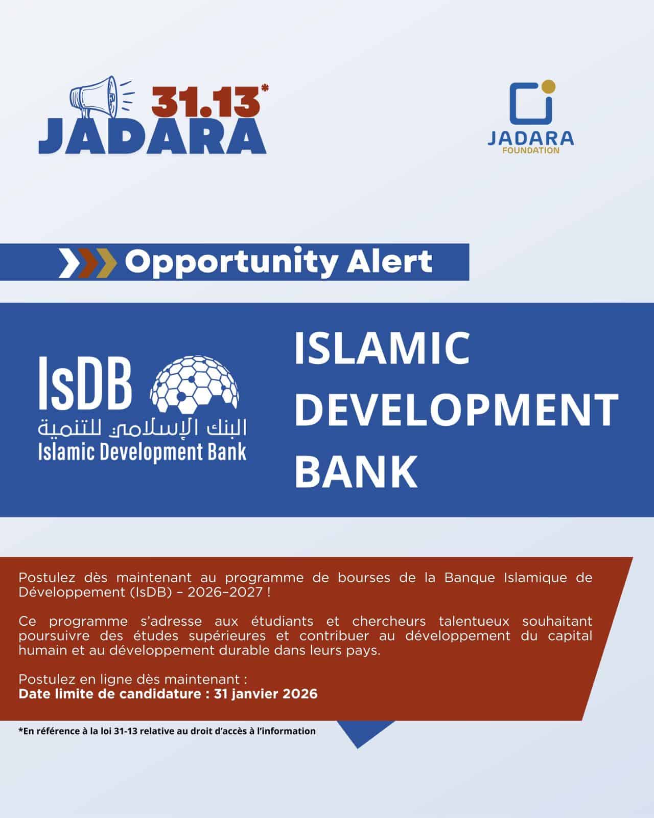 L'Islamic Development Bank (IsDB) lance son programme de bourses 2026–2027 destiné aux étudiants et chercheurs souhaitant poursuivre des études supérieures et contribuer au développement durable de leurs pays. Ce programme vise à former une nouvelle génération de leaders et d'experts capables d'impacter positivement leurs communautés.