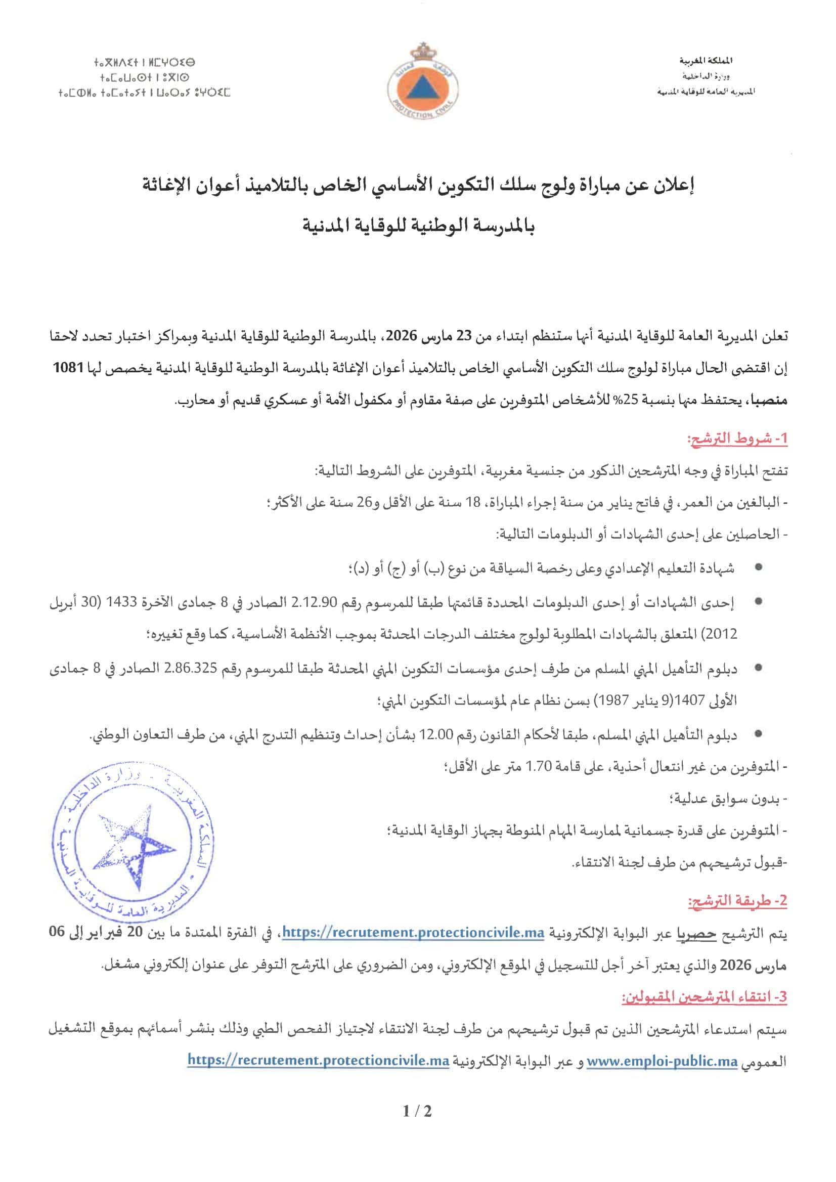 Mode de candidature: Inscription exclusivement en ligne sur https://recrutement.protectioncivile.ma