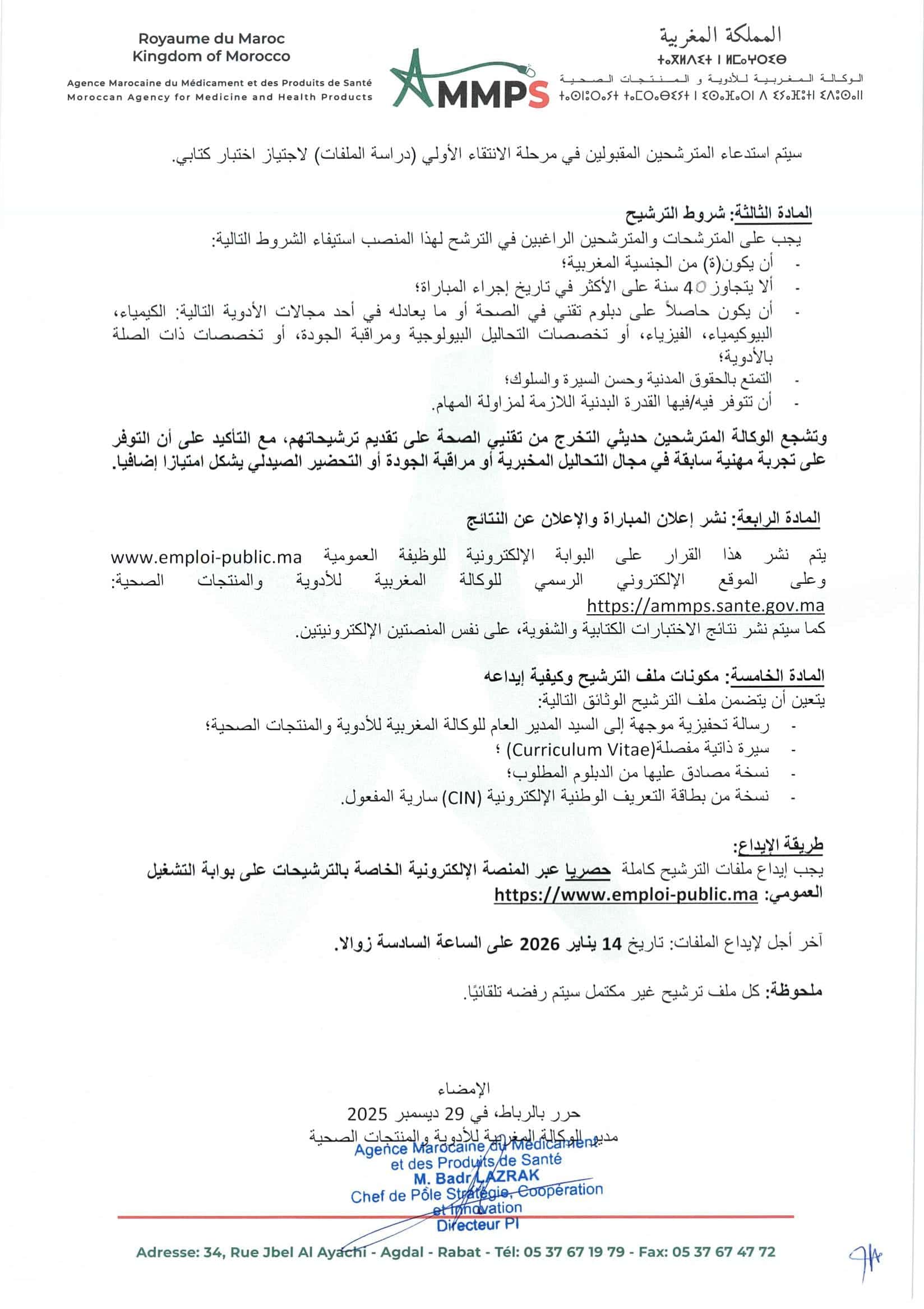 L'Agence Marocaine des Médicaments et des Produits de Santé (AMMPS) lance un concours pour le recrutement de 57 postes répartis comme suit :