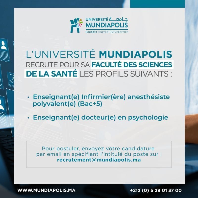 L'Université Mundiapolis, établissement privé reconnu au Maroc et membre du réseau Honoris United Universities, recrute deux enseignants à Casablanca. Les postes concernent des spécialistes en soins infirmiers anesthésiques et en psychologie, avec des exigences académiques strictes et des responsabilités pédagogiques variées.