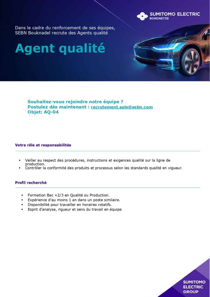 SEBN Maroc, filiale du groupe japonais Sumitomo Electric Industries, recrute des Agents Qualité pour renforcer ses équipes à Salé Bouknadel. Les candidats doivent détenir un Bac+2 ou Bac+3 en qualité/production et avoir une expérience industrielle.