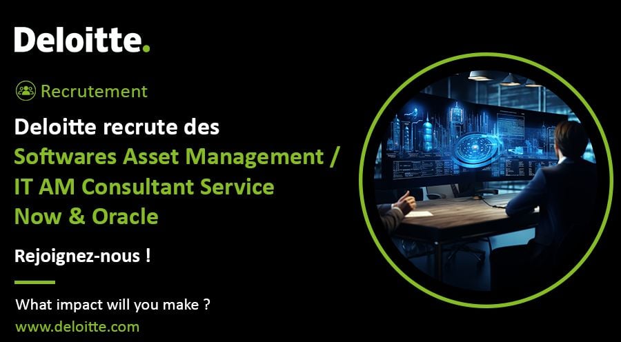 Deloitte Extended Services, filiale à 100 % de Deloitte France basée à Casablanca, recrute des consultants juniors à confirmés dans les domaines du Software Asset Management (SAM) et IT Asset Management (ITAM), spécialisés Oracle et ServiceNow. Les postes s'adressent à des professionnels avec 2 à 3 ans d'expérience souhaitant évoluer dans un environnement de conseil structuré et international.