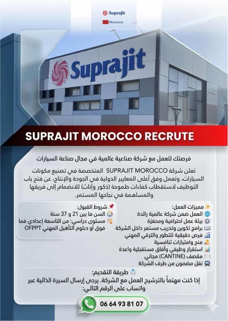 Suprajit Morocco, filiale du groupe international Suprajit spécialisé dans la fabrication de câbles automobiles et d’ampoules halogènes, recherche des opérateurs et opératrices de production pour renforcer ses équipes industrielles.