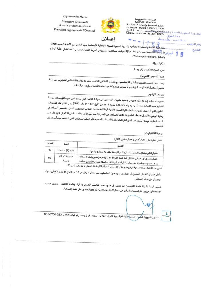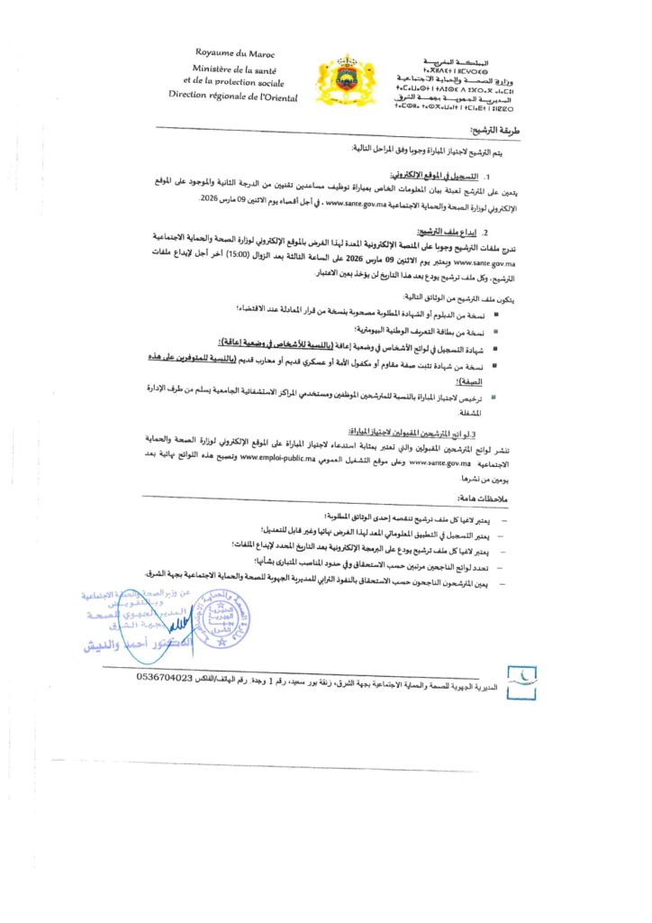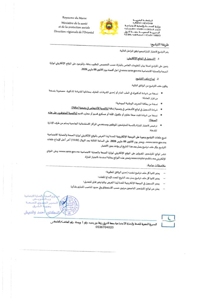 طريقة التقديم: يجب تقديم الترشيحات عبر الموقع الرسمي للمديرية الجهوية للصحة لجهة الشرق: المزيد من التفاصيل
