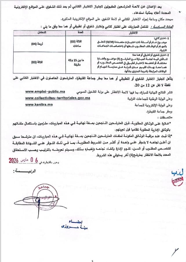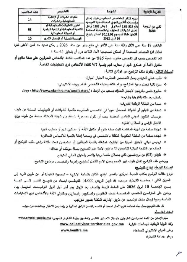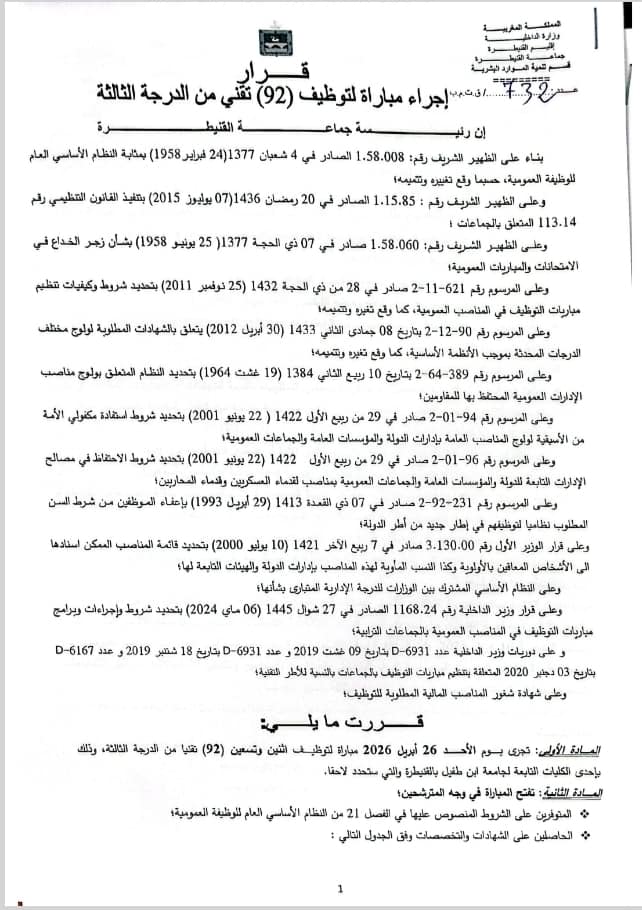 تعلن جماعة القنيطرة عن تنظيم مباراة للتوظيف في درجة 92 تقني من الدرجة الثالثة (سلم 9)، آخر أجل هو 26 أبريل 2026
