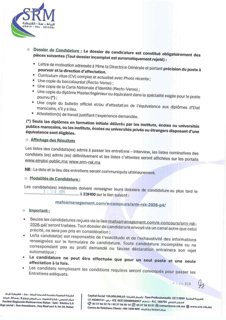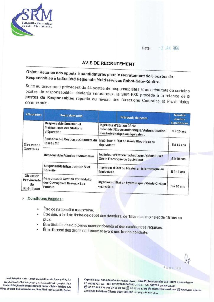 Dans le cadre du renforcement de ses équipes, la SRM-RSK annonce le lancement d’un concours de recrutement pour 5 postes de responsables, répartis entre les directions centrales et provinciales.