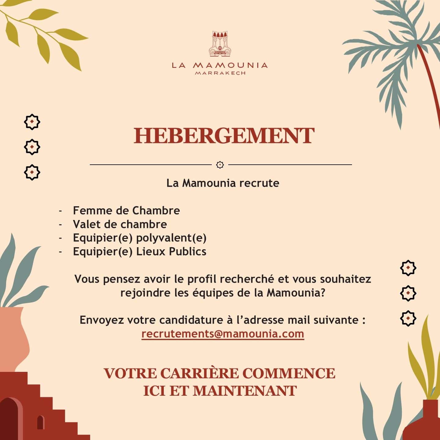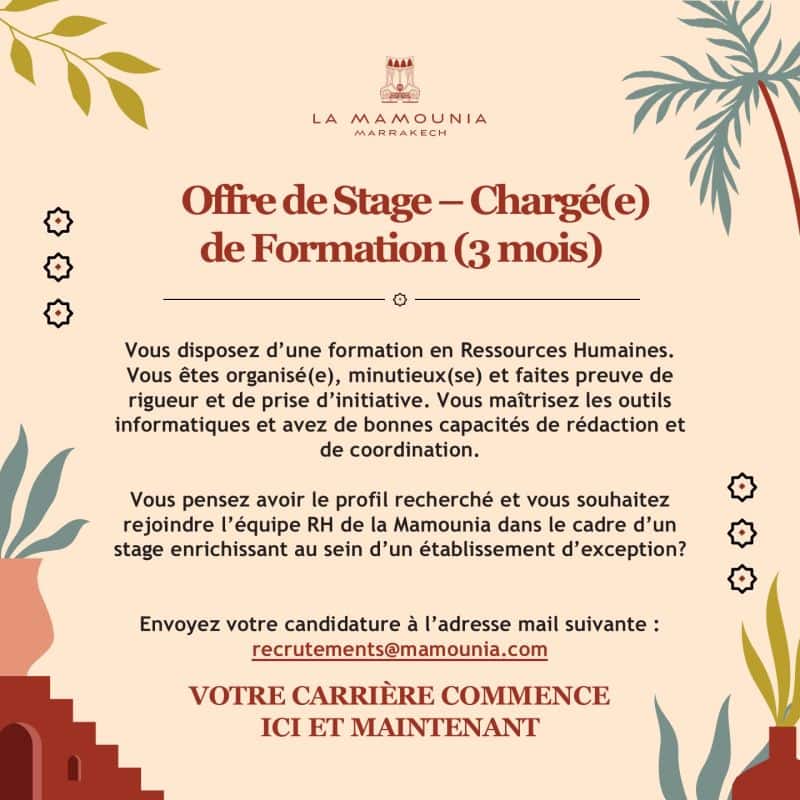 La Mamounia Marrakech, hôtel de luxe internationalement reconnu, recrute pour des postes en CDI et en stage dans les départements de restauration, hébergement, spa, transport clients et ressources humaines.