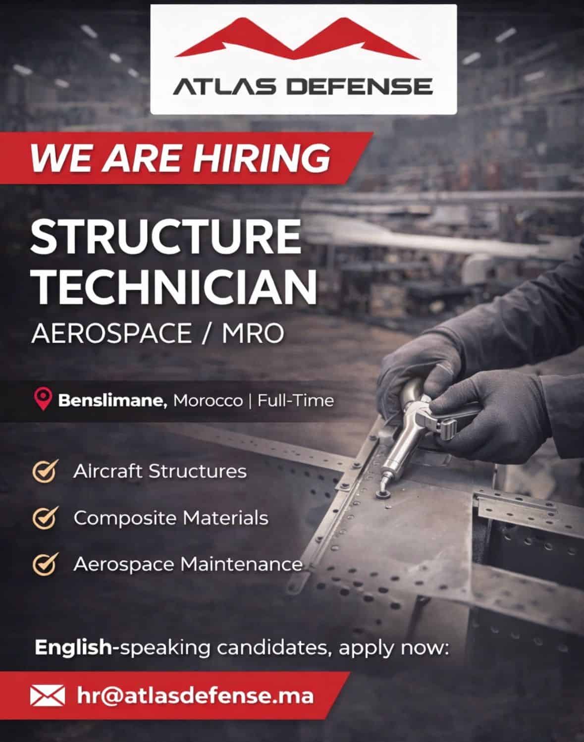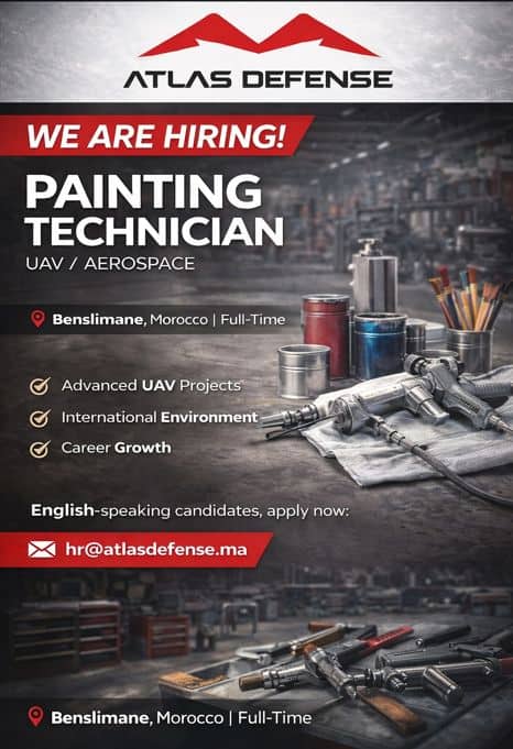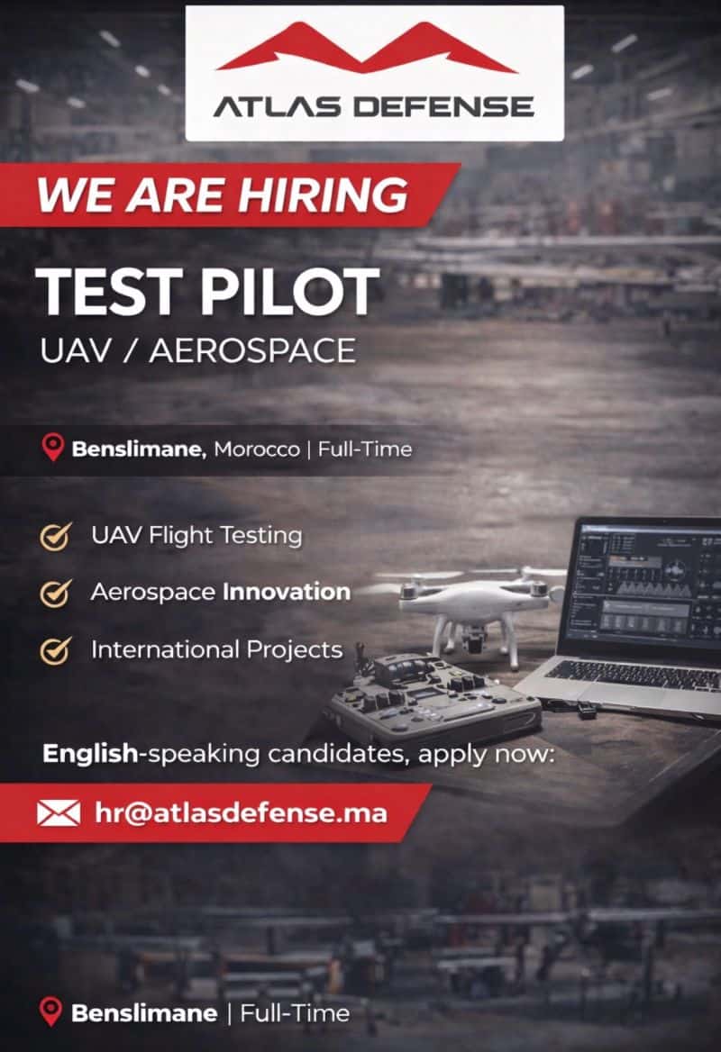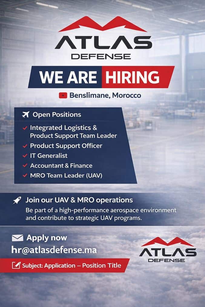 Atlas Defense, entreprise marocaine spécialisée dans la maintenance et le support technique des drones (UAV), lance un recrutement pour plusieurs postes en CDI à Benslimane. Les offres concernent des profils techniques dans l'aéronautique, les drones et les fonctions support (logistique, IT, finance).