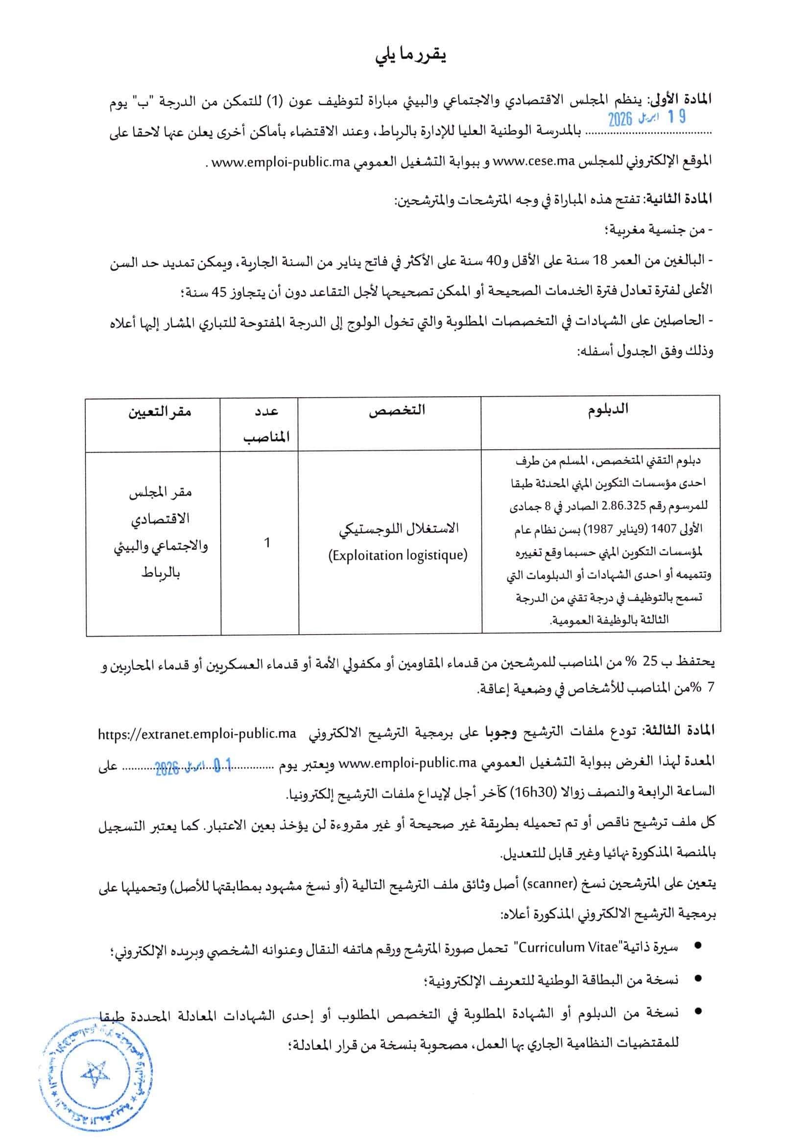 Le concours aura lieu le 19 Avril 2026.