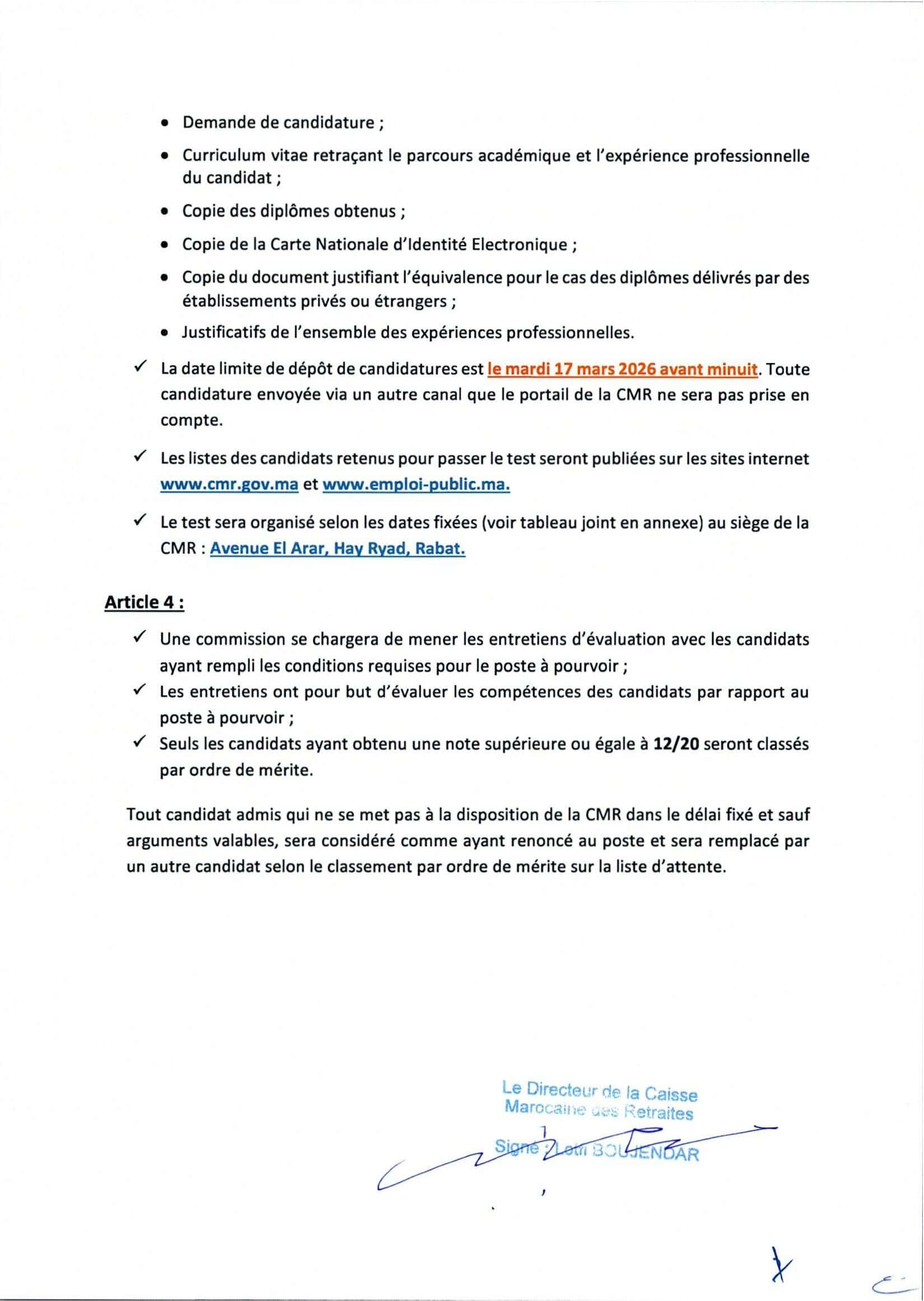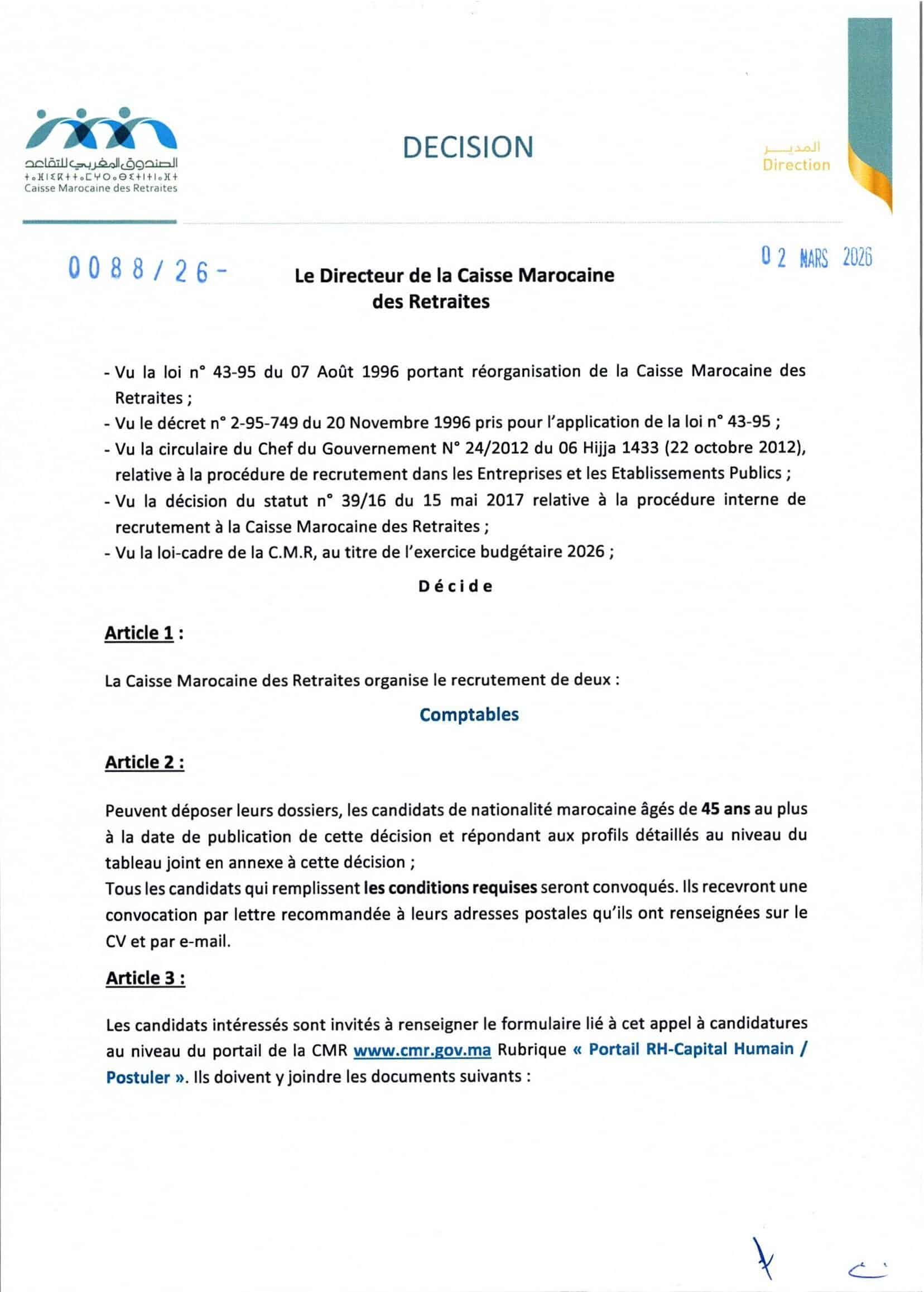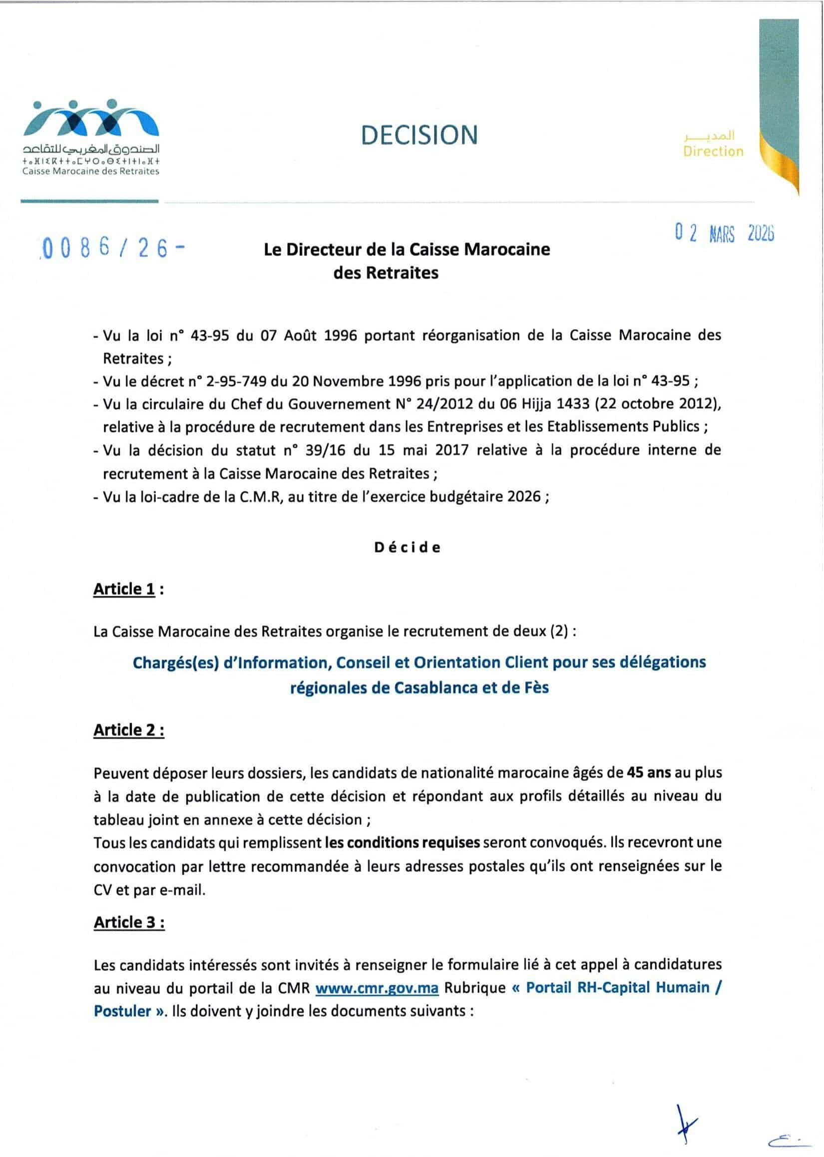 La Caisse Marocaine des Retraites (CMR) lance un concours pour le recrutement de 4 postes répartis comme suit :